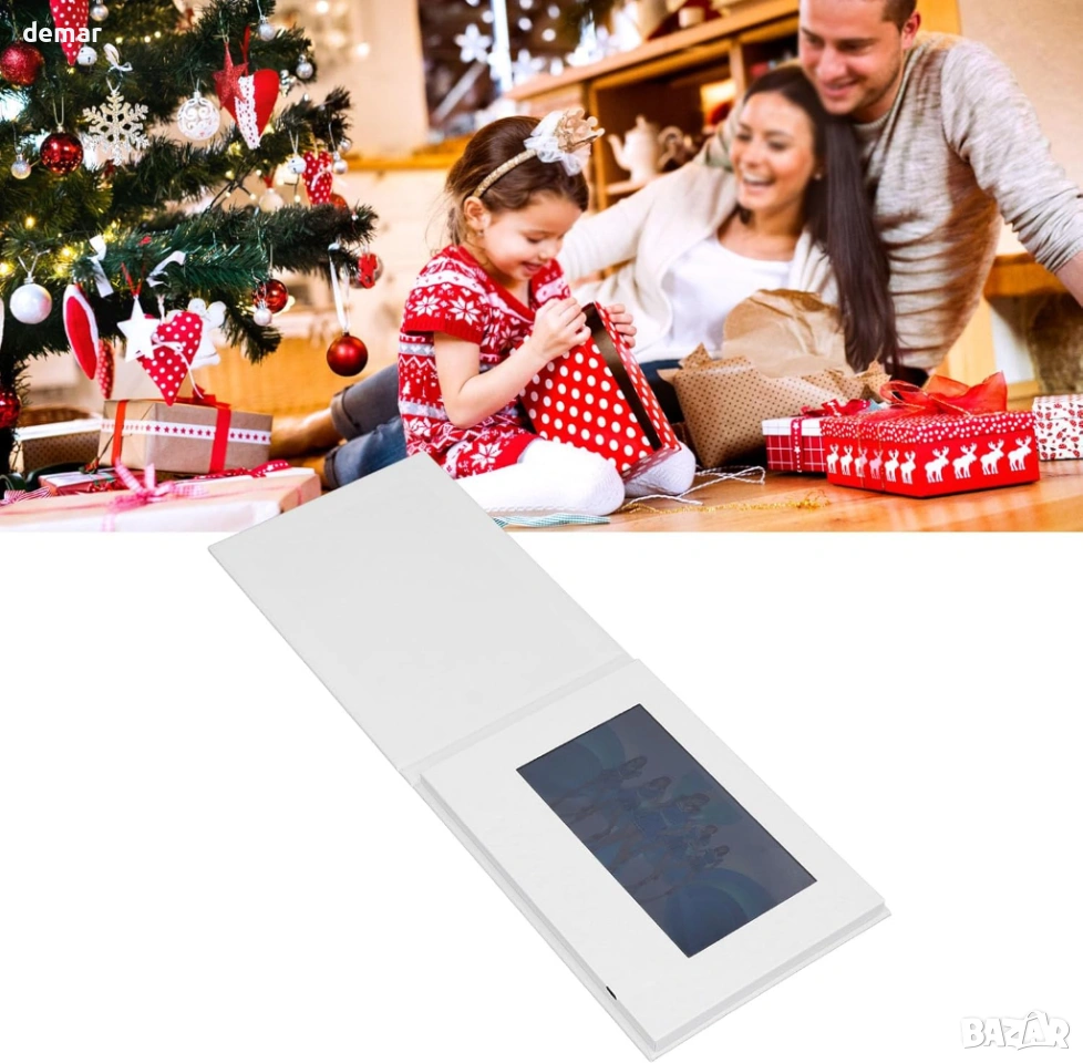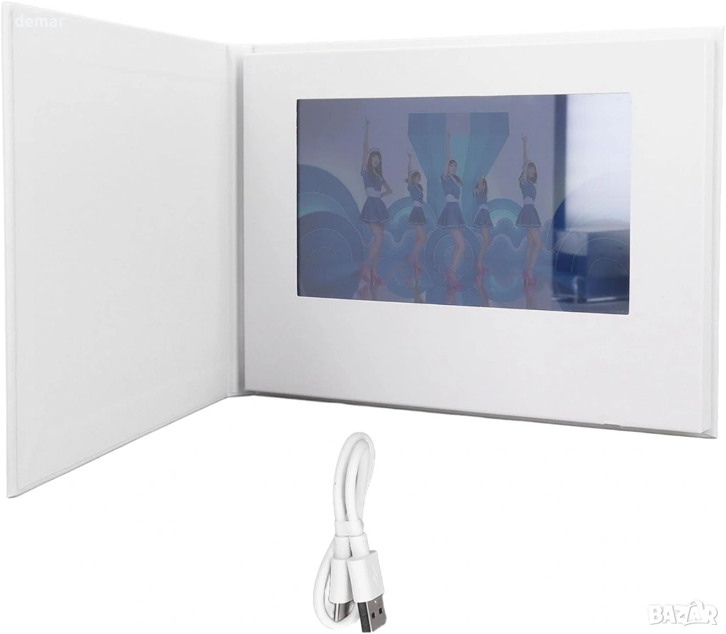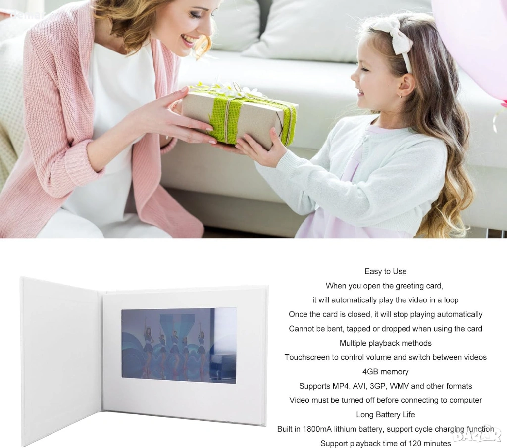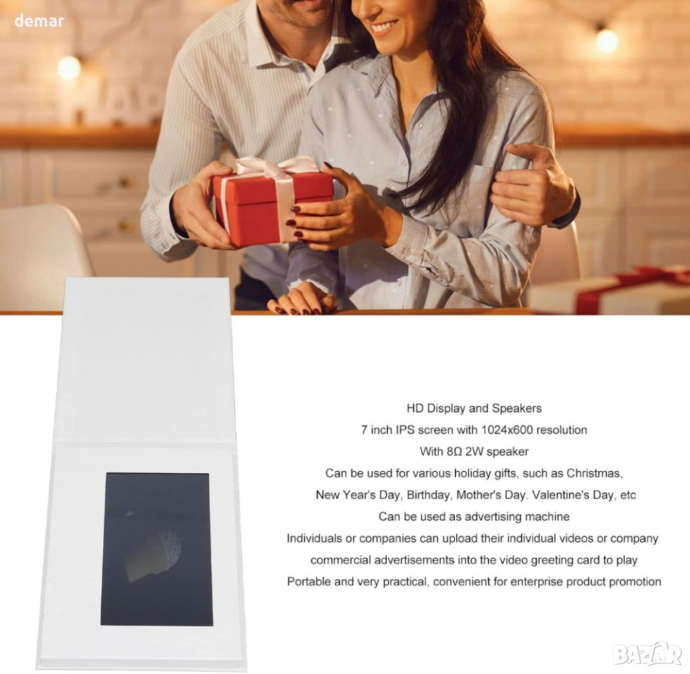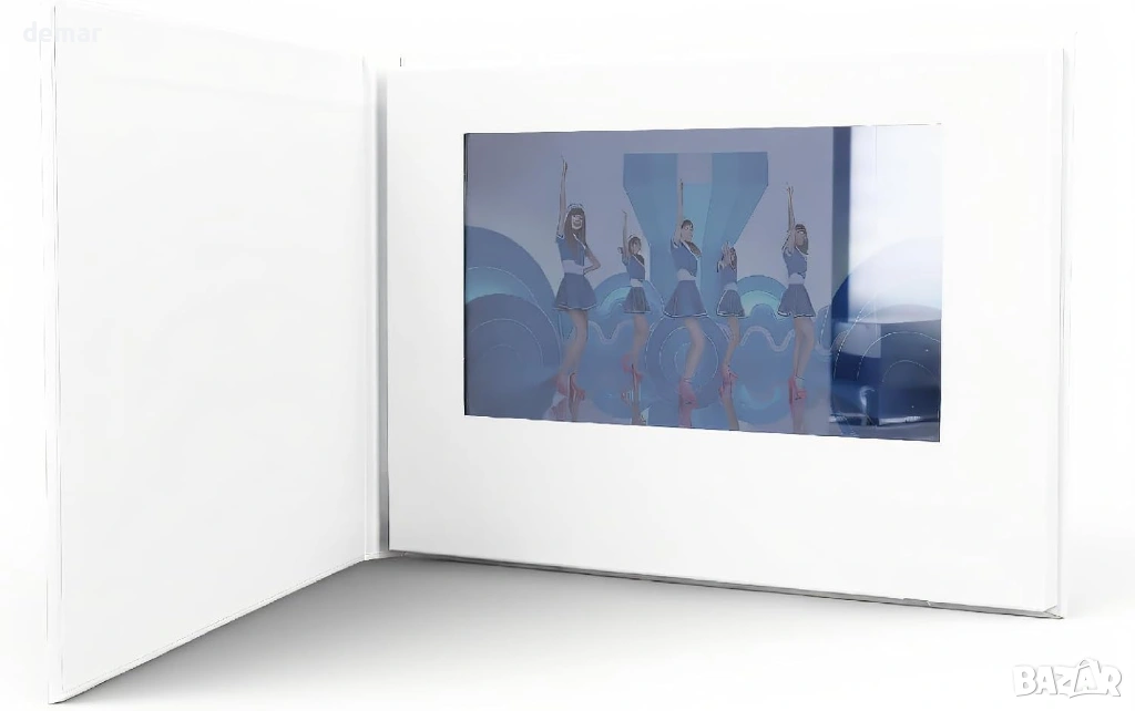 Видео поздравителна картичка със 7-инчов IPS дисплей (резолюция 1024 × 600) и вграден високоговорител осигурява ясно видео и звук за персонализирани съобщения, промоции или специални поводи като рождени дни, Коледа, Свети Валентин и Ден на майката. Проектирана както за лични подаръци, така и за бизнес реклама, потребителите могат да качват персонализирани видеоклипове или фирмени реклами директно на устройството. Картата възпроизвежда видео автоматично при отваряне и спира при затваряне, а сензорният екран позволява лесно управление на силата на звука и превключване на видео. Поддържа множество видео формати, включително MP4, AVI, 3GP и WMV, и се свързва с компютър за прехвърляне на файлове. Захранвана от акумулаторна литиево-йонна батерия с капацитет 1800mAh и 4GB вътрешна памет, тя осигурява до 120 минути възпроизвеждане и поддържа многократно зареждане за продължителна употреба.