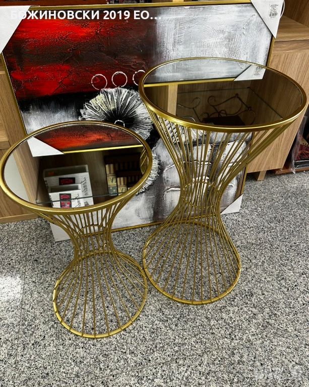 Комплект от две помощни масички с огледален плот и метална основа в златен цвят → Обява 53836490