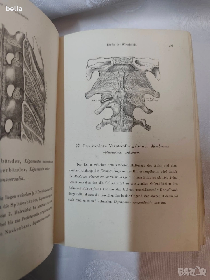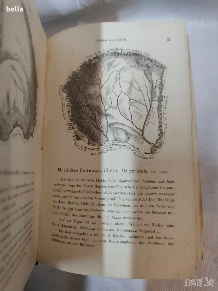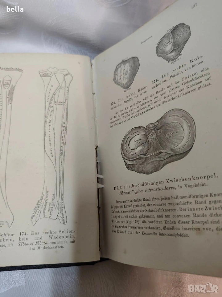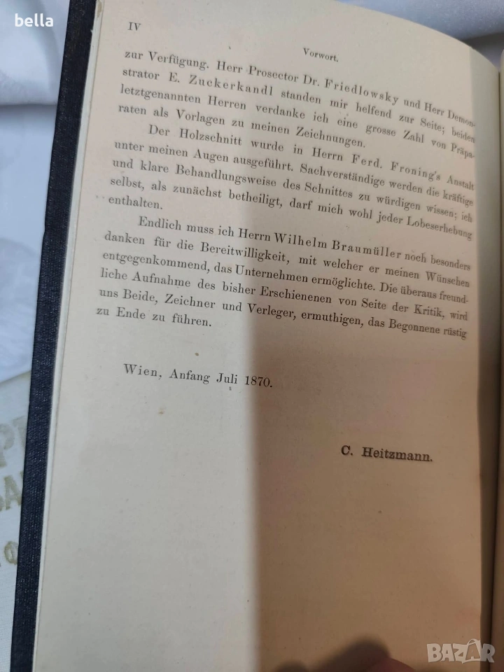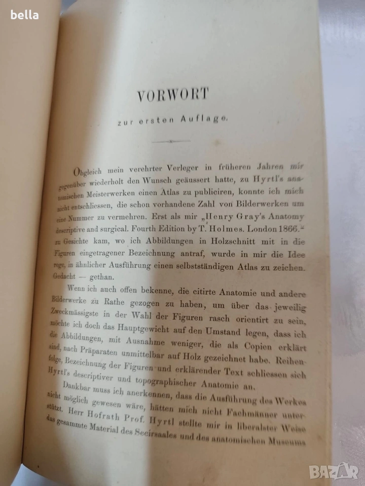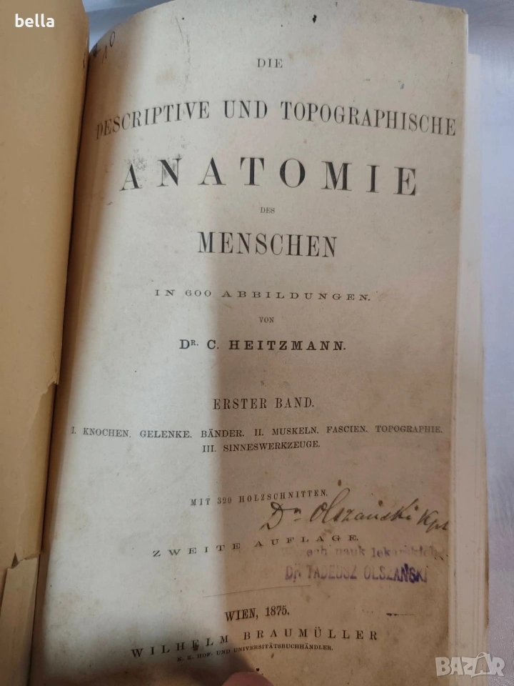 Антикварен медицински атлас по Анатомия (1875 г.) – Dr. Heitzmann Продавам ценно антикварно издание на немски език: „Die descriptive und topographische Anatomie des Menschen“ от д-р Карл Хайцман. Книгата е издадена във Виена през 1875 г. от престижното издателство Wilhelm Braumüller. ​Том: Първи (Erster Band) – включва кости, стави, връзки, мускули и сетивни органи. ​Илюстрации: Съдържа 320 изключително детайлни дървореза (гравюри), които са запазени в отлично състояние. ​Състояние: Твърда подвързия, нормални следи от времето за 150-годишна книга. Автентични печати и подписи на предишен собственик (медицинско лице). ​Език: Немски (латинска терминология).2 леки заблежки в начлото и към средта в долния крй леко тлото е отделено. ​Рядък екземпляр, подходящ за колекционери, лекари или за декорация на медицински кабинети.Цена 150 евро
