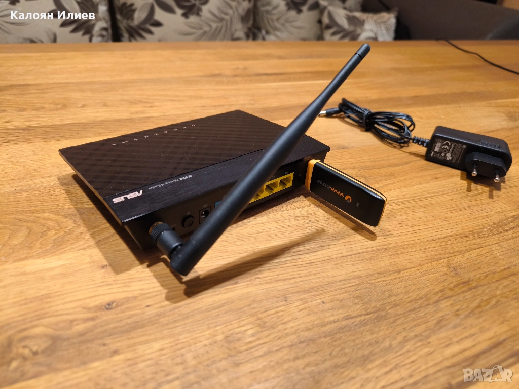 Работещ рутер Asus RT-N10U. Със захранването и подарък модем за SIM карта, който работи отлично с USB порта на рутера и може да се използва за бекъп на връзката, ако ви спре кабелния интернет. Модема може да работи само с карти на Виваком (вижда се на последните 2 снимки).