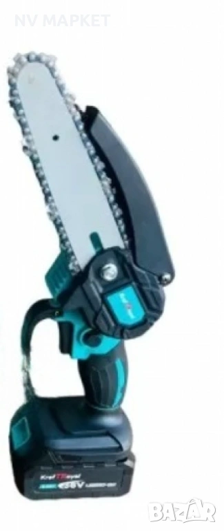 Акумулаторна резачка: 15 см верижна лента, електрически мотор 36V, време за рязане: 10 секунди на греда 25 см;