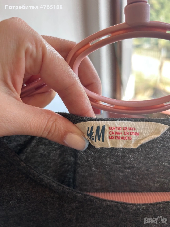Сивата блуза не е носена, размерите са с и хс, като според мен и двете стават и за двата размера! Марката е H&M и на двете блузи!