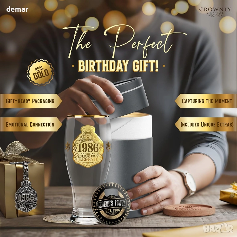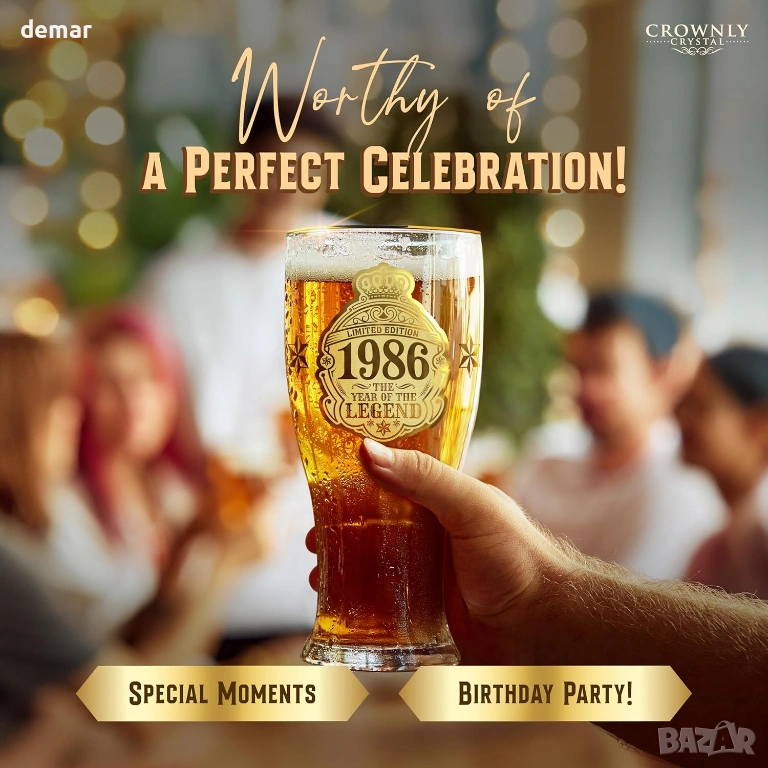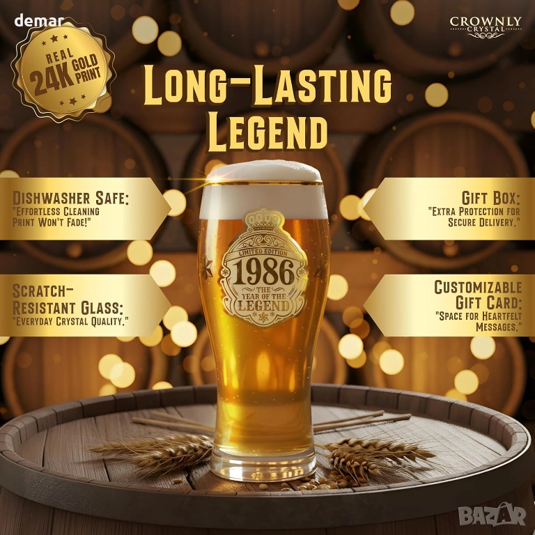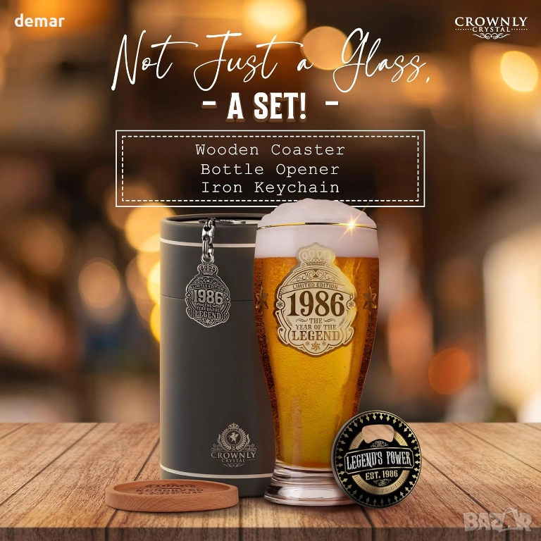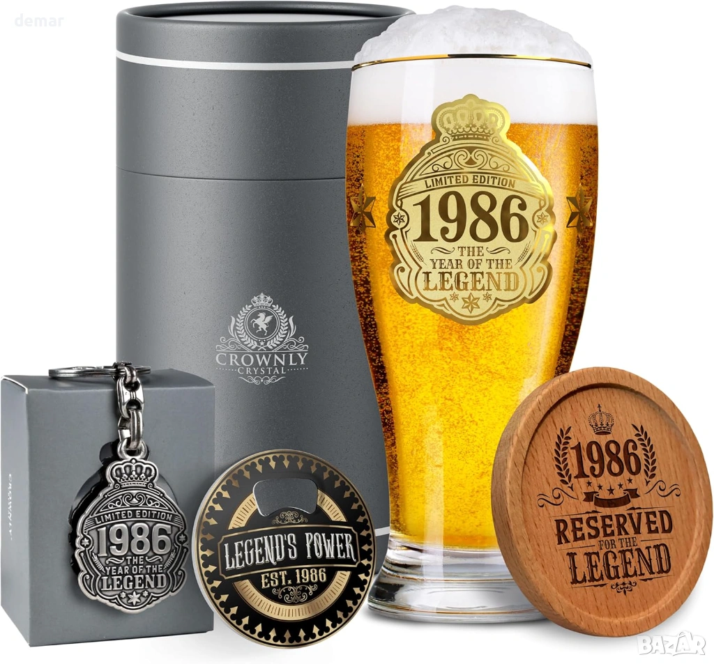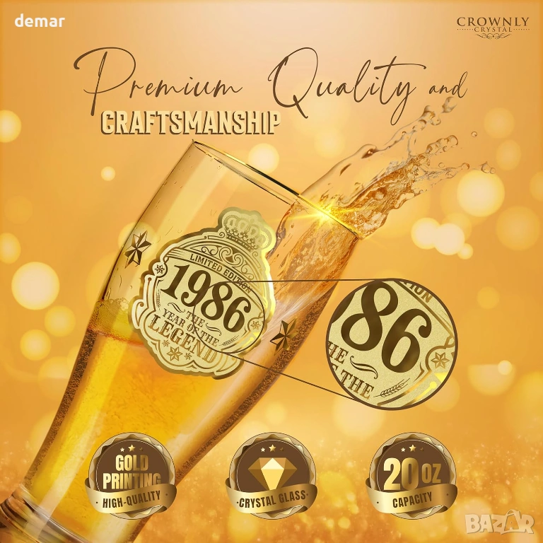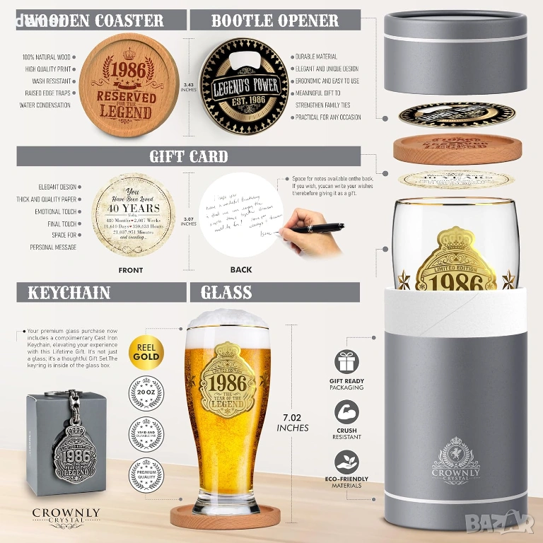 Чаша за бира с лимитирана серия, посветена на 40-ия рожден ден, предназначена за родените през 1986 г., проектирана като запомнящ се сувенир и уникален подарък за любителите на бира. Чашата е с златен принт „1986 — Годината на легендата“ за впечатляващ вид и носталгично усещане. Предлага се в първокласна подаръчна кутия, включваща подложка за чаша, отварачка за бутилки, ключодържател и празна картичка за лично послание, което я прави готова за подаряване без допълнително опаковане. Здравата чаша за бира има удобен захват и дебела основа за стабилност, подходяща за наслаждаване на лагер, ейл, стаут или безалкохолни напитки у дома, в барове, на партита или барбекюта. Препоръчва се миене на ръка, за да се запази яркият златен принт.
