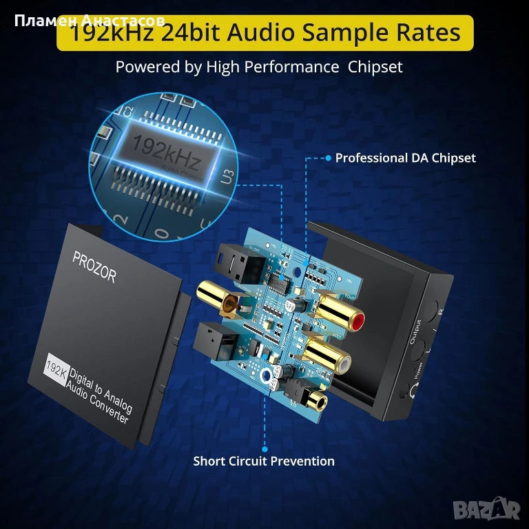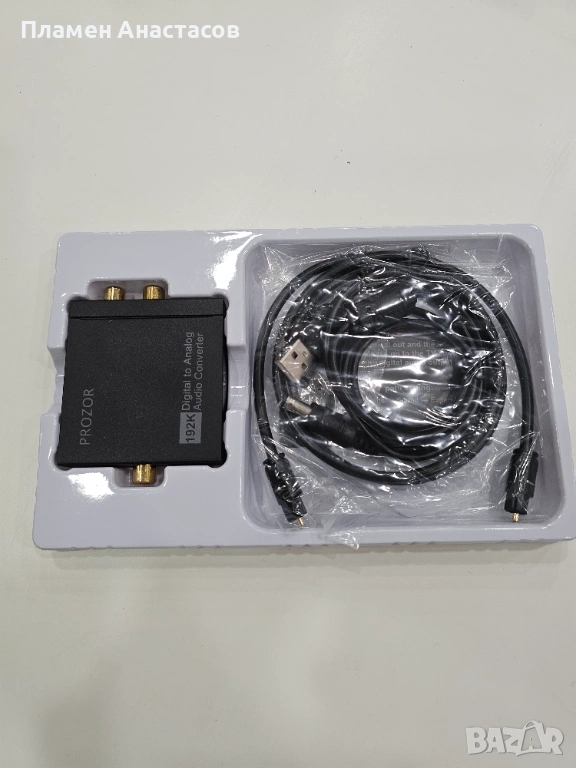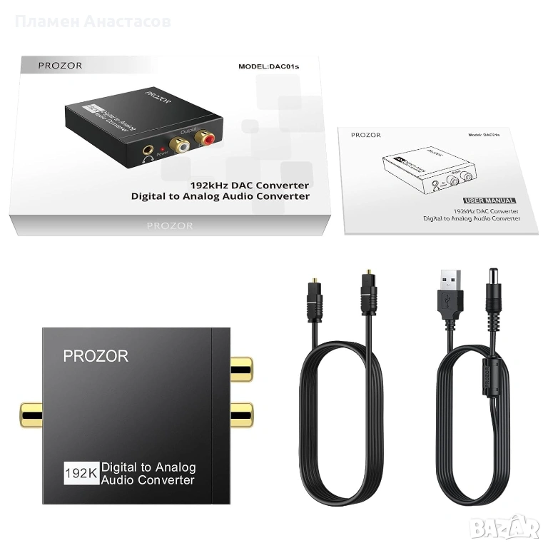 PROZOR 192KHz Digital to Analog Audio Converter е практичен аудио адаптер, който преобразува цифров звук от SPDIF / Toslink оптичен или коаксиален вход към аналогов стерео изход (RCA L/R или 3.5 mm жак). Това позволява свързване на модерни устройства като телевизори, игрови конзоли или Blu-ray плейъри към по-стари аудио системи, усилватели или активни тонколони.
