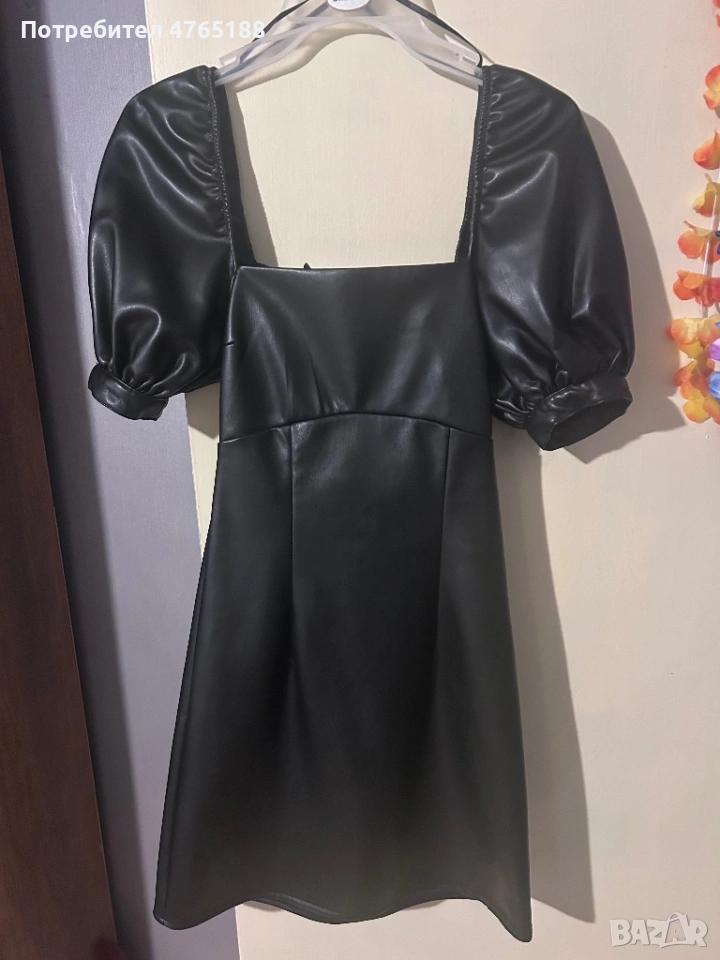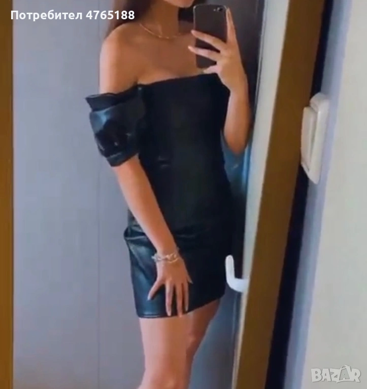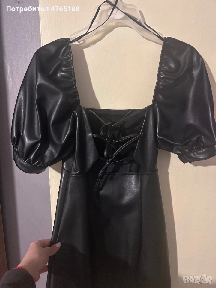 Черна кожена рокля в къс стил. Идеална за специални поводи. С връзки на гърба, помагат за регулирането на деколтето. Закопчава се с цип отстрани. Ръкавите могат да се носят паднали.