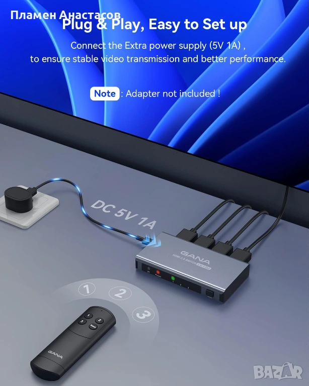 GANA HDMI Switch 3-in-1 Out е практично решение за всеки, който използва няколко HDMI устройства и иска лесно и бързо превключване между тях без разместване на кабели.