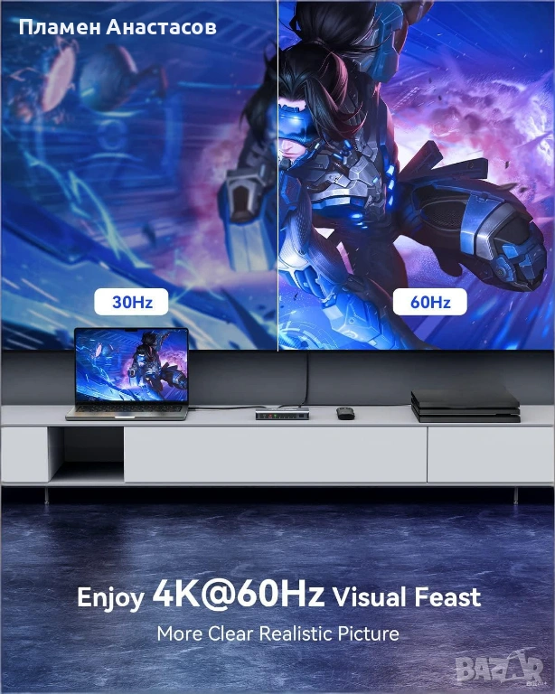 Устройството поддържа резолюция до 4K@60Hz, което осигурява висококачествено изображение с ясни детайли и плавна картина. Съвместимо е и с по-ниски резолюции като 4K@30Hz, 2K@120Hz и 1080p@240Hz, както и с технологии като HDR, 3D и HDCP 2.2.