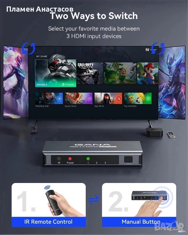 HDMI превключвателят позволява управление по два начина – чрез дистанционно управление или чрез бутон на самото устройство. LED индикатор показва кой вход е активен в момента, което улеснява използването.