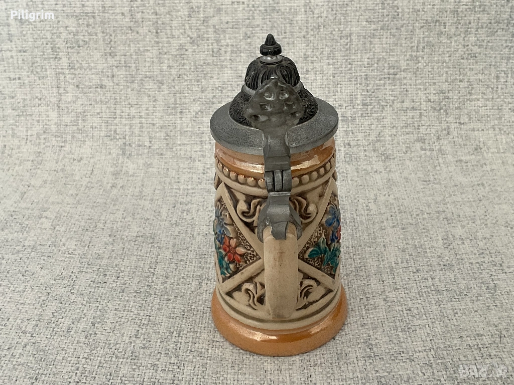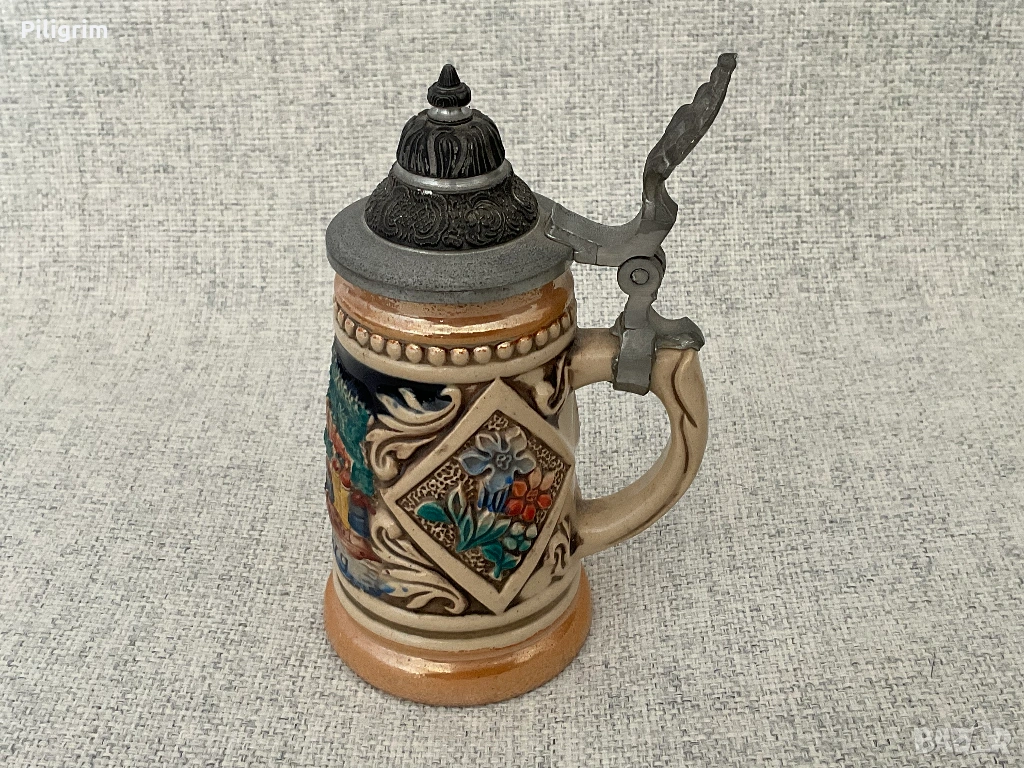 Чаша за бира, керамична, вместимост 0.1 литра. Халба за бира в баварски стил с метален капак. - Флорален и орнаментален дизайн. - Бежово и охра покритие. - Капак с декоративни детайли.