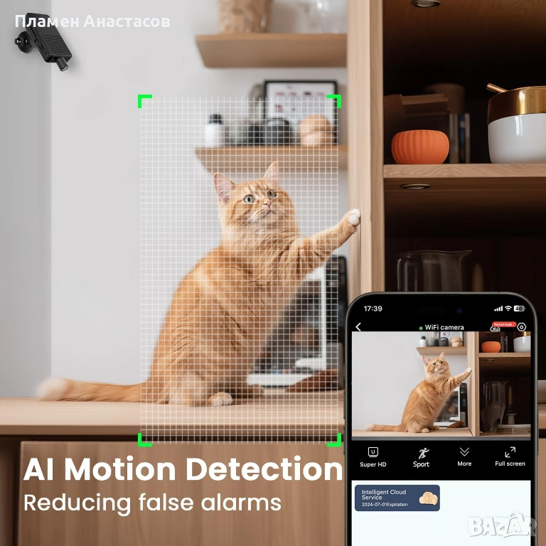 Вградената AI детекция на движение намалява фалшивите сигнали и изпраща известие към телефона при засичане на активност. Това позволява бърза реакция и по-ефективно наблюдение.