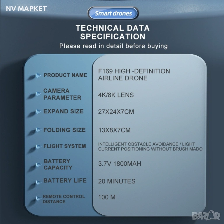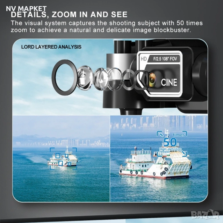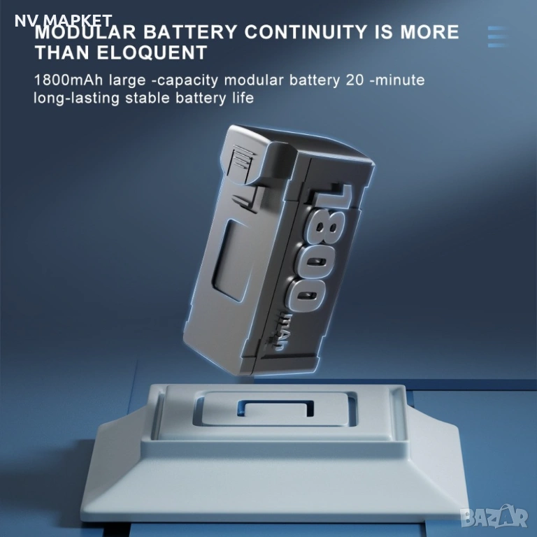 - Предният обектив е поставен с широкоъгълен 6K WIFI с висока разделителна способност, а долният обектив с висока разделителна способност с оптичен поток може да превключва ъгъла на камерата, - Функцията за фиксиране на височина има функция за режим на поддържане на височината и позиционирането на оптичния поток и функцията с фиксирана точка има стабилен полет. - Изключително дълга издръжливост 3.7V 1800mAh литиево-йонна батерия, която може да издържи около 10 минути, - Персонализирайте маршрута.