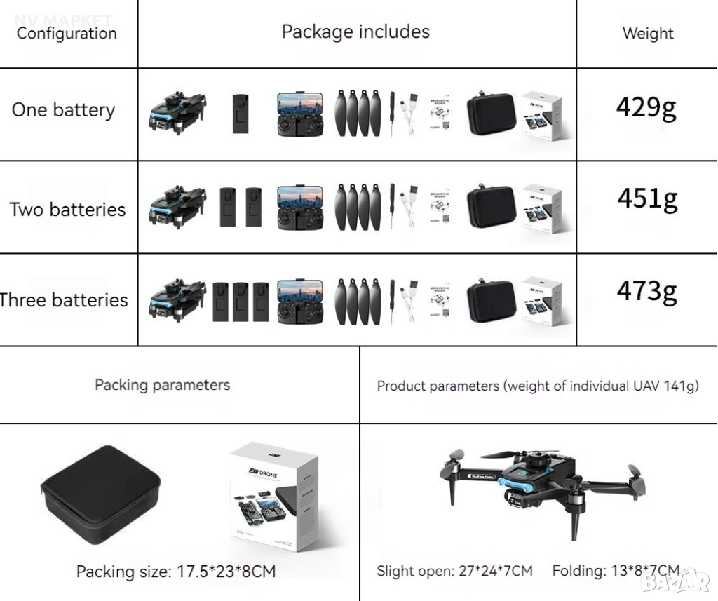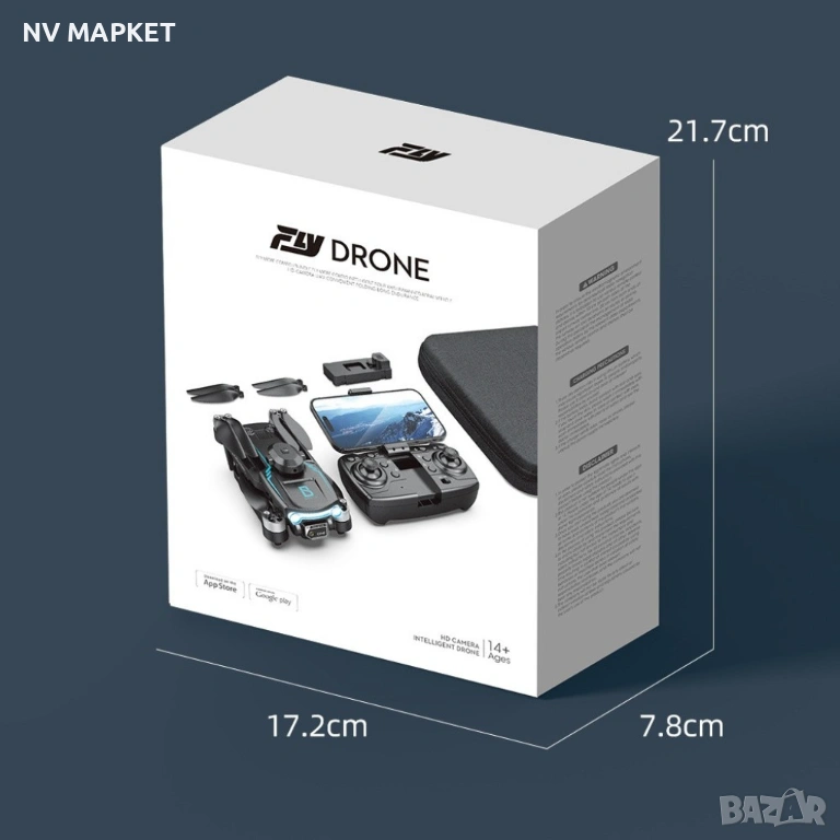 Функция: нагоре/надолу, отпред/назад, завой наляво/надясно, страничен полет, скорост на полета на три нива, около полет, полет по точка, режим на задържане на надморска височина, режим без глава, връщане с един ключ, излитане и кацане с един ключ, WiFi FPV, 360° избягване на препятствия
