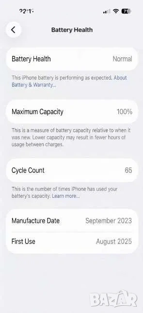 Капацитет на батерията (Battery Health - 100% - сменена е с чисто нова оригинална батерия). +подарък калъфи