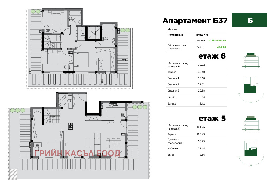 Апартамент Б37 е със застроена площ 202,55м2, а с общи части 231,72. Терасите към мезонета са с обща площ 142,83м2.