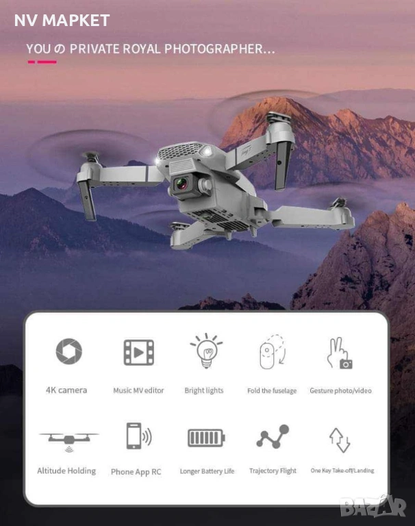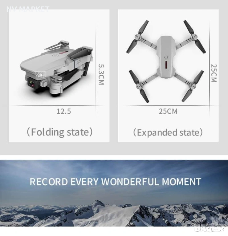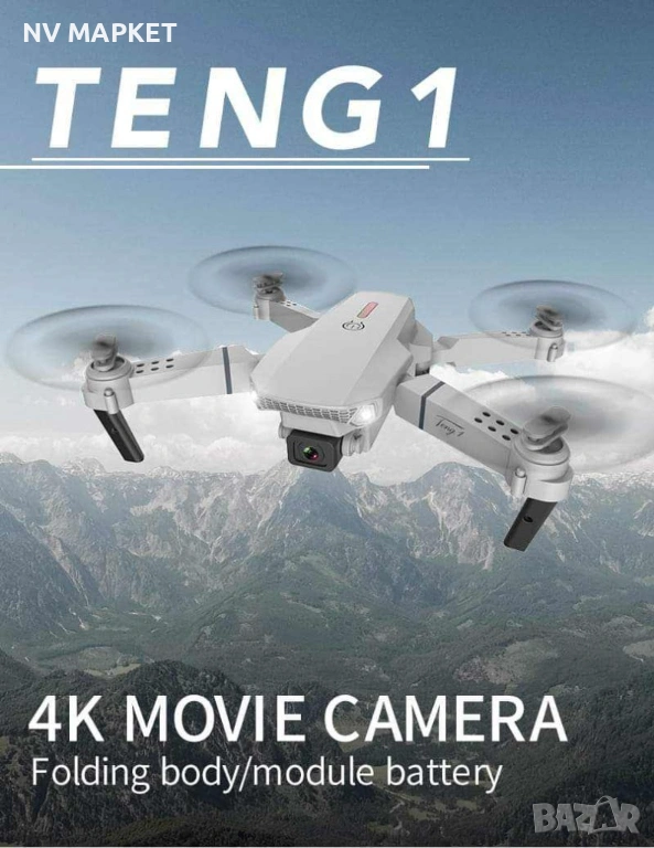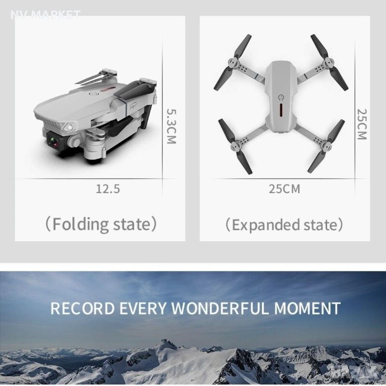 Дрон, 4k HD двойна камера/ Технически характеристики: Тип продукт: Дрон; Маневреност: Въздух; Захранване: Акумулатор; Състояние: Сглобен; Материал: Пластмаса; Цвят: Сив; Операционна система: Android, iOS; Свързаност: Wi-Fi; Тип акумулатор: Йонно - литиева батерия, 3.7V 540 mAh; Максимална дистанция: 150 м; Автономия при полет: 12 мин; Видео резолюция: Full HD, 4К; Поддържащи устройства: Смартфон; Работна честота: 2.4 GHz; Дистанционно: Да; Батерия на дистанционното: 3х АА, 1.5V; Функции: Автоматично кацане, Автоматично издигане, Сгъваем; Лесен за съхранение; Лесен за управление; Чиста и ясна картина със страхотни изображения; Размери: Разгънат: 25х25 см, Сгън: 12.5х 8.1 см.