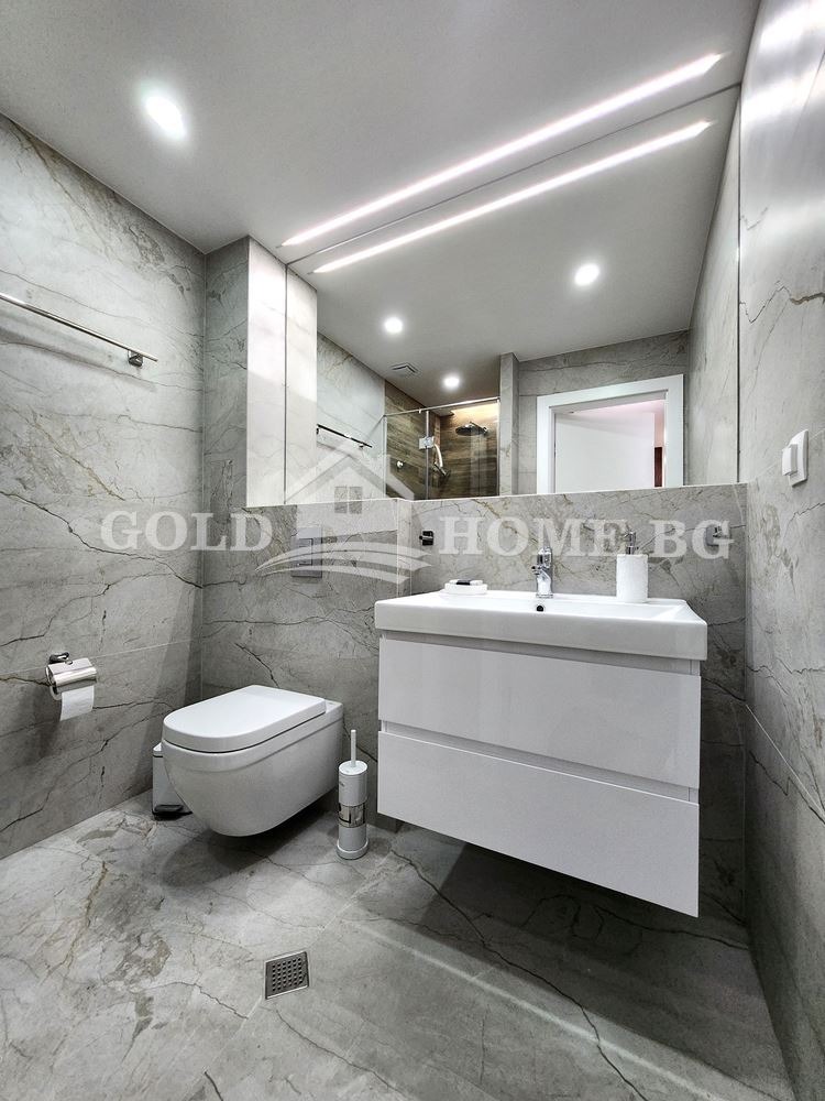 - Баня - вградена структура, душ система, мивка с шкаф и огледало на цяла стена - оборудването е на марката GROHE
