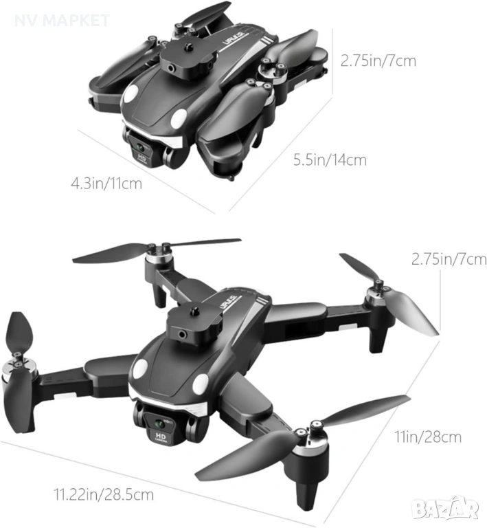 Материали: Пластмаса, метал, електронни компоненти; Цвят: Черен; Честота: 2.4G; Мотор: Безчетков мотор за по-голяма издръжливост и ефективност; Устойчивост на вятър: Ниво 7; Камера: 4K HD, ръчно регулируема до 90 градуса; Канали: 4CH; Подходяща възраст: 14+; Батерия: 3.7V 1800mAh lipo; Време за зареждане: 90 минути; Време на полет: Около 12 минути; Обхват на дистанционното управление: До 150 метра; Разстояние за предаване на изображението: До 150 метра; Сигнал за предаване на изображение: WiFi; Режим на зареждане: USB кабел за зареждане; Разгънат: 28,5x28x7 см (11,2x11x2,76 инча); Сгънат: 11x14x7 см (14.3x5.5x2.76 инча); Опаковка: 22x17x8 см (38.7x6.7x3.15 инча); Тегло: 349 г (0.7 lb).