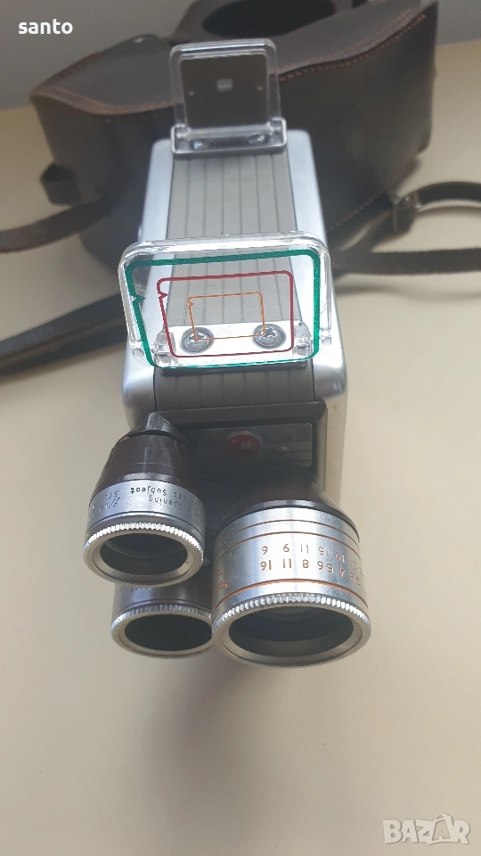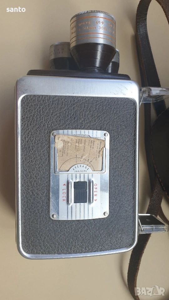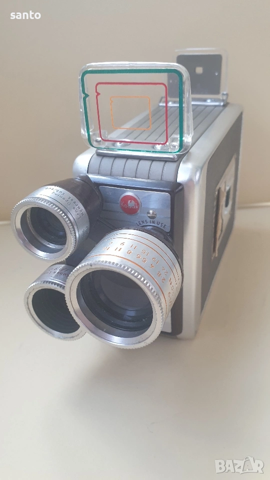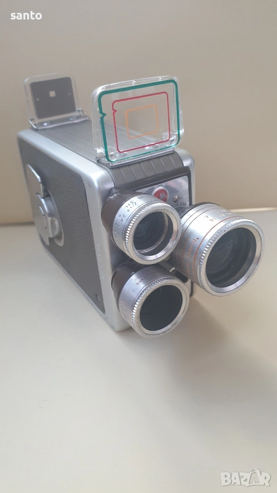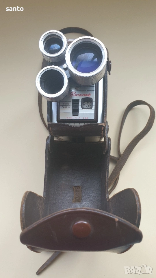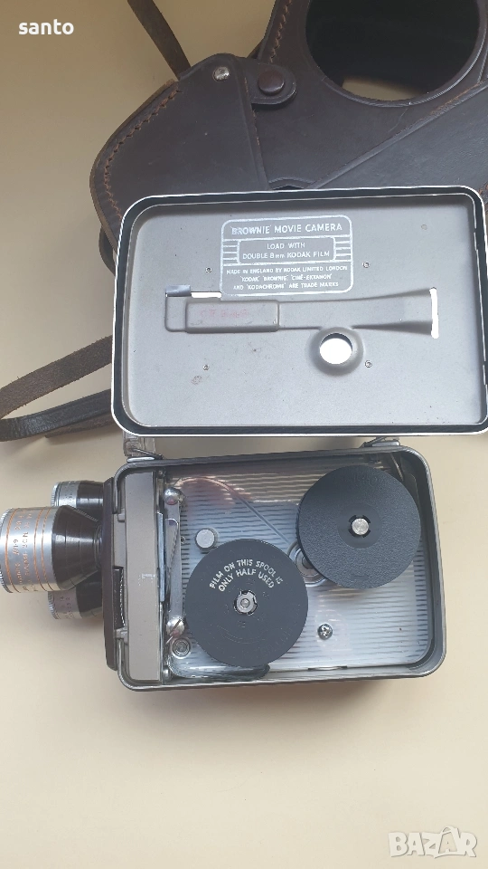 Автоматична 8мм филмова камера Kodak Brownie Movie camara Turret,произведена в Англия през 50 години.Пружинният механизъм е тестван и работи с характерното за модела бръмчене.Въртящи се глави с три обектива,лещите са здрави.Комплект с оригинален кожен калъф с логото на Kodak. Made in England