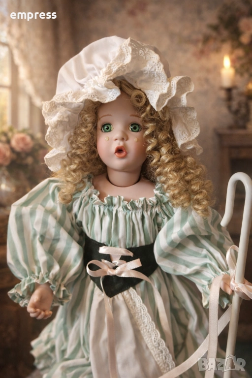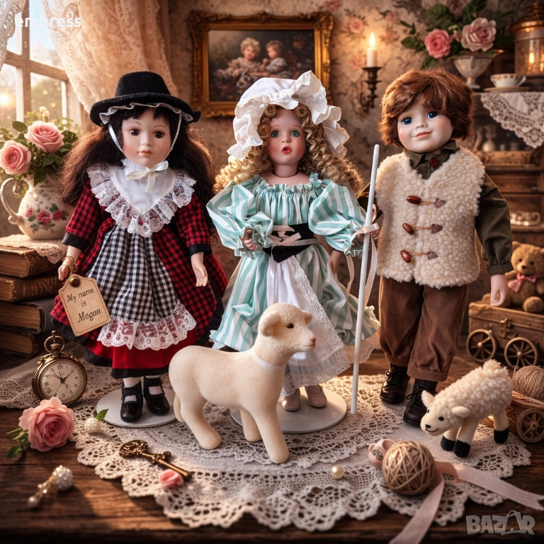 Особено впечатляващи са техните детайлни и стилни облекла. Едната кукла е облечена в елегантна рокля с червено каре, комбинирана с фина дантела и класическа шапка, създаваща истинско винтидж излъчване. Втората кукла е в нежна пастелна рокля с фини райета и богата дантелена шапка – изключително романтична и характерна за старинните колекционерски модели. Третата кукла е представена като малък овчар, облечен в топъл елек с дървени копчета и държи овчарска гега – допълнен от декоративни агънца, които придават още по-очарователна атмосфера на композицията.