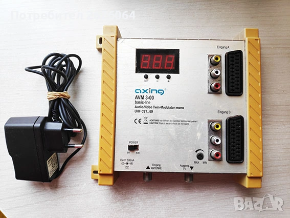 модулира два А/V сигнала в UHF канали за връзка с телевизор