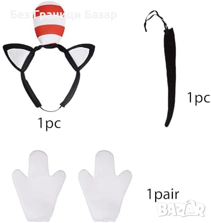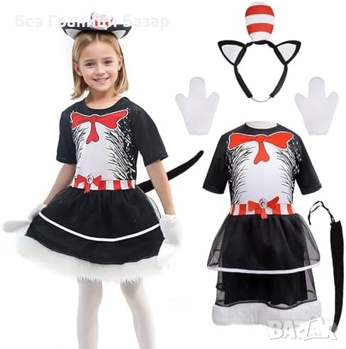 Пълен детски костюм на черно коте с рокля, ушички, ръкавици и опашка