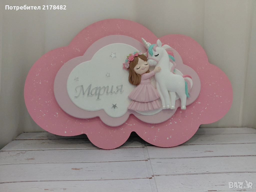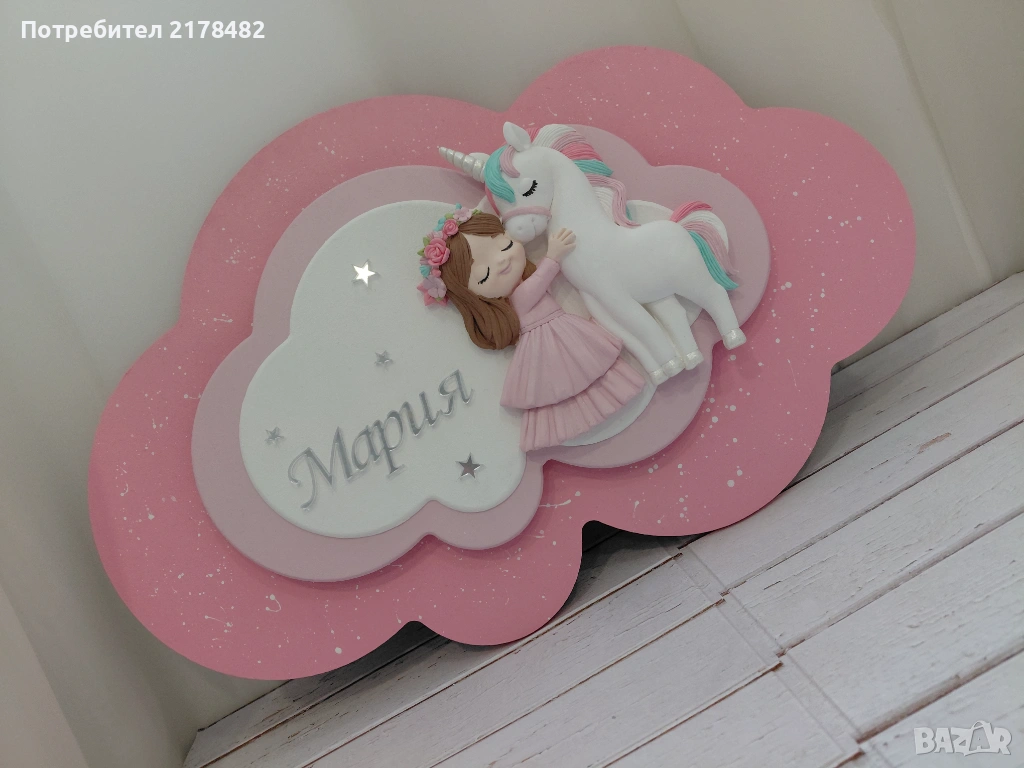 Декоративна дървена лампа с изображение на момиче и еднорог. Подходяща за детска стая или декорация на стена. Изработена е в розово-бял цвят с блестящи елементи. Размерите на лампата са подходящи за поставяне на стена.