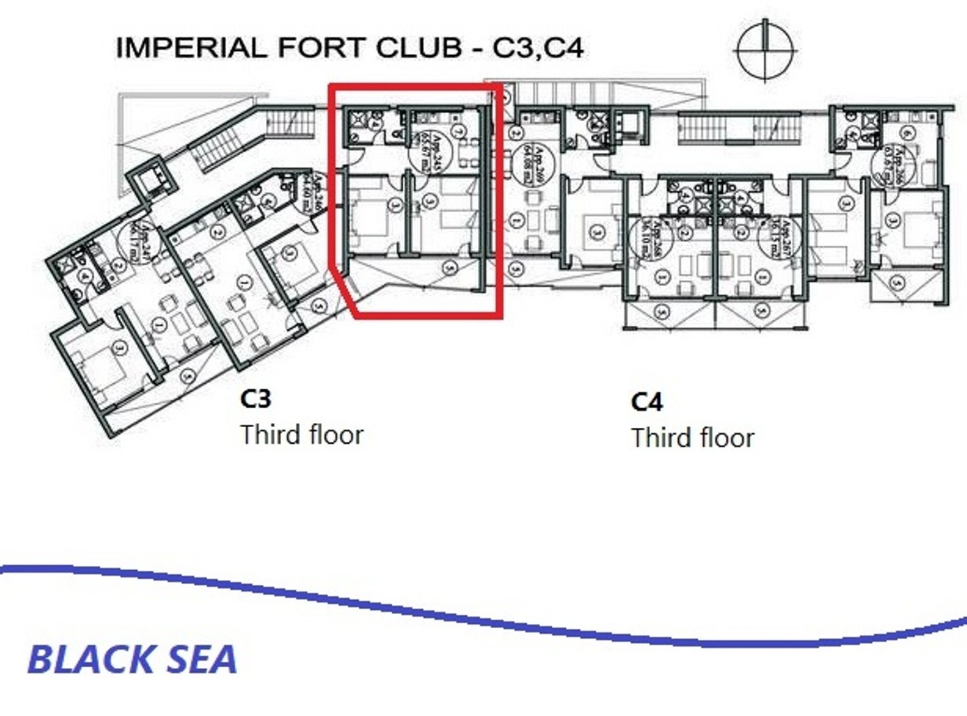 Тристаен апартамент 82 м2 с гледка към морето Империал Форт Нокс Свети Влас. Разстояние до морето 205 метра.