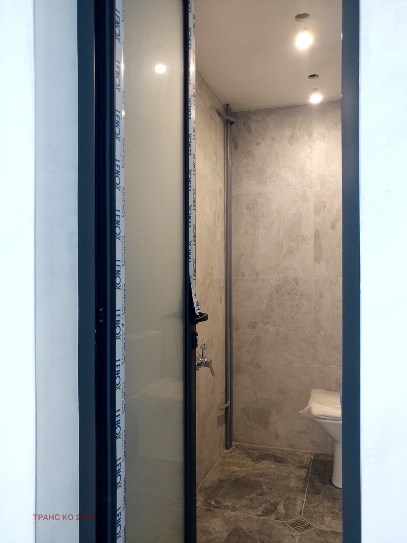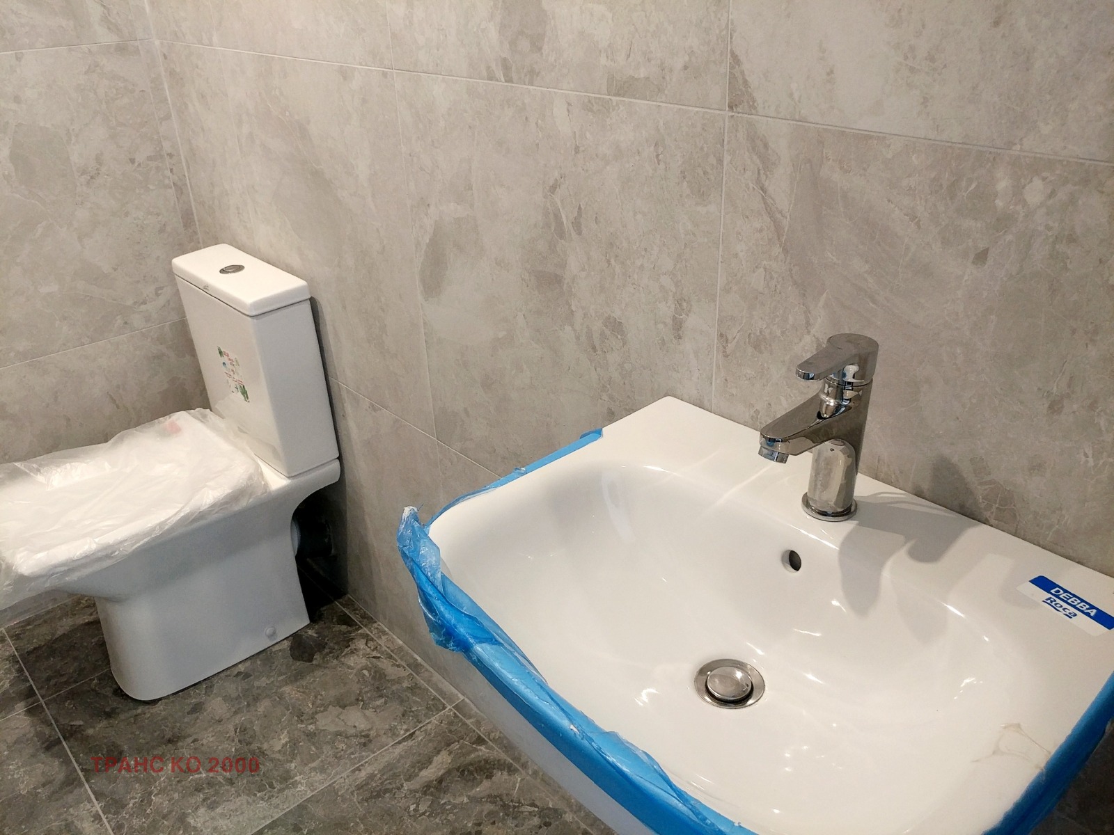 Баня: Моноблок Hansgrohe, с вграден механизъм Geberit; Смесител и мивка Roca; Облицовка подова и стенна: италиански гранитогрес 60x60 см: Dom Design Lab MUN MAT (https://ascotcer.it/collezioni/mun)