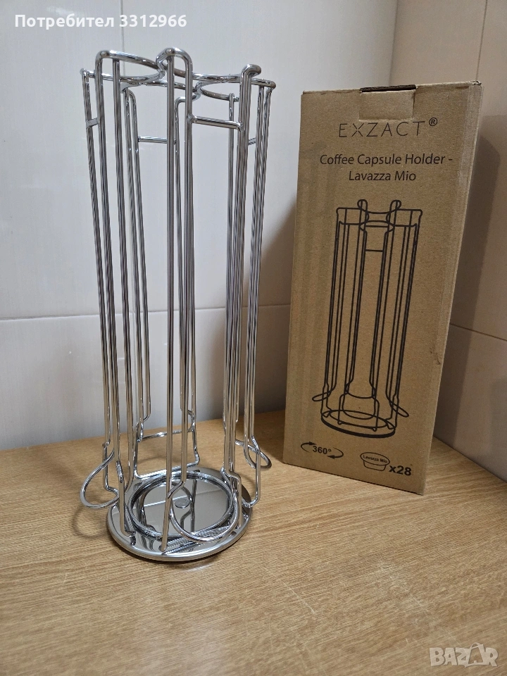 Чисто нова метална поставка за кафе капсули EXZACT, предназначена за съвместимост с Lavazza Mio. Капацитет: Побира до 28 капсули. Функции: Въртяща се основа на 360 градуса за лесен достъп. Материал: Хромирано покритие, устойчиво и лесно за почистване. Размери: Приблизително 14.5 x 14.5 x 31.5 см.