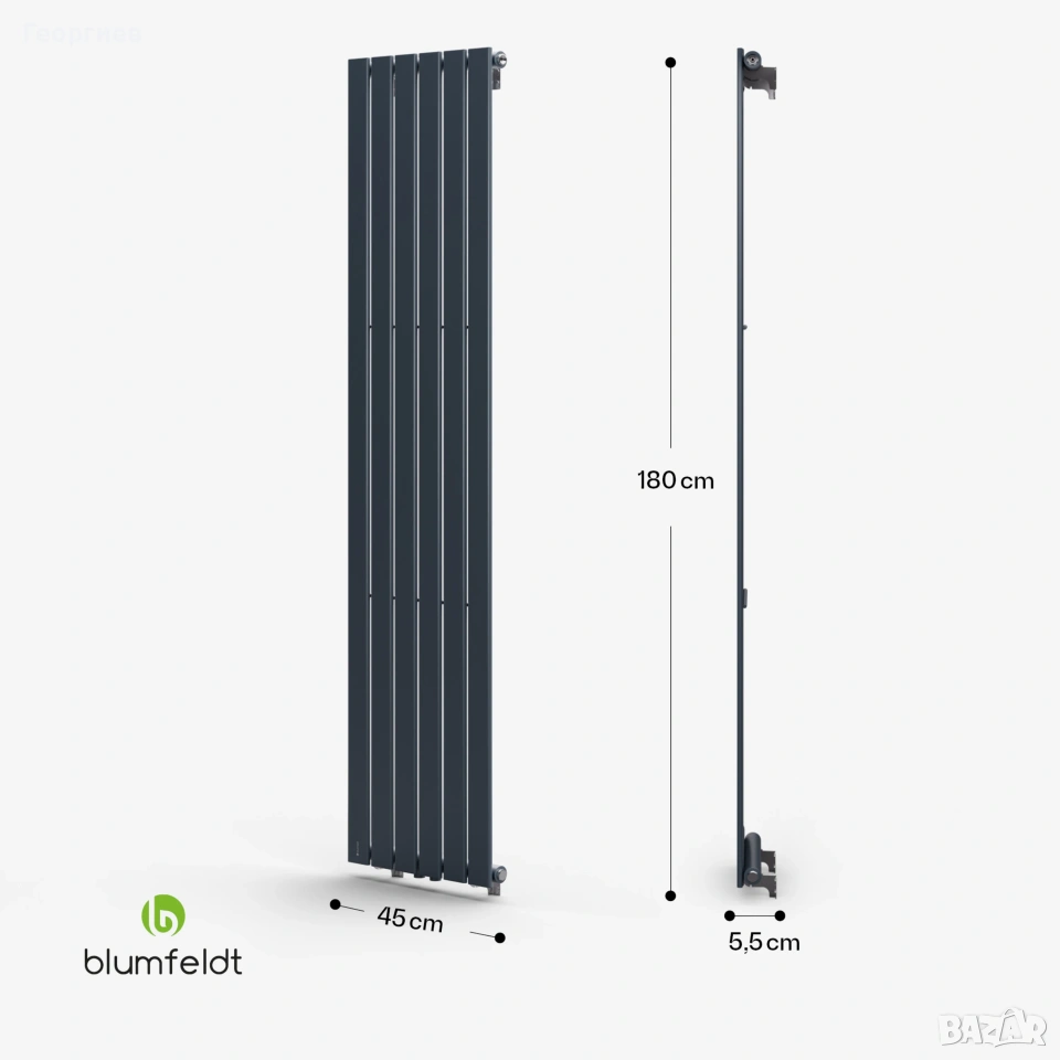 Модерен вертикален радиатор с размери 45 x 180 см, подходящ за отопление на помещения. Изработен от висококачествени материали, осигурява ефективно разпределение на топлината.
