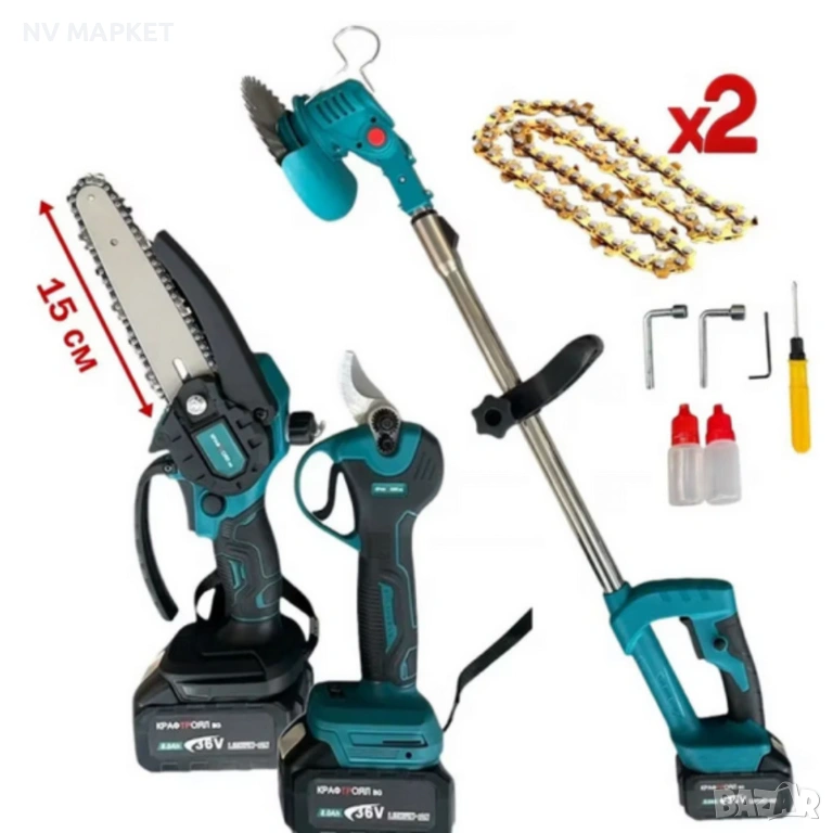 Акумулаторен трион: 36V, 8Ah, дължина на веригата и шината 15 см, обороти до 10 000 об./мин, време на работа до 50 мин.