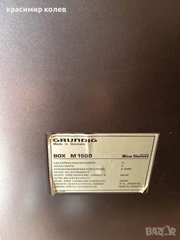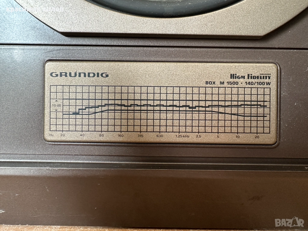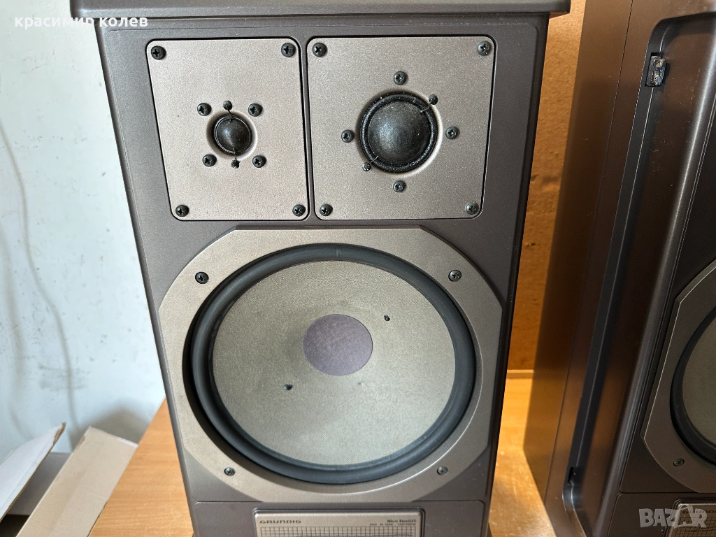 - Конструкция: Включва голям басов говорител, куполен средночестотен и куполен високочестотен говорител. Характерна е металната плочка в долната част с логото на Grundig и графика на честотната характеристика.