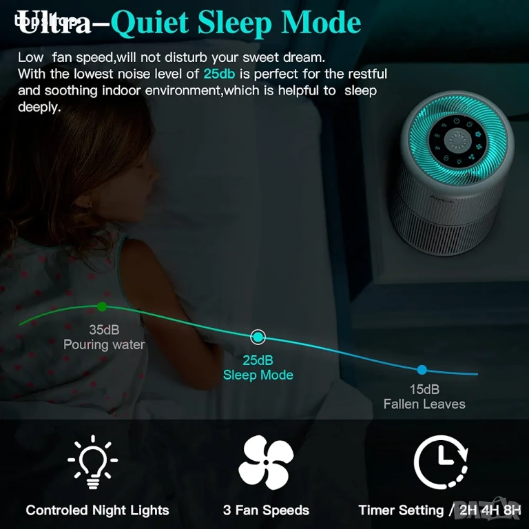 Изключително тих: В нощен режим шумът е под 25 децибела, което го прави незабележим по време на сън.