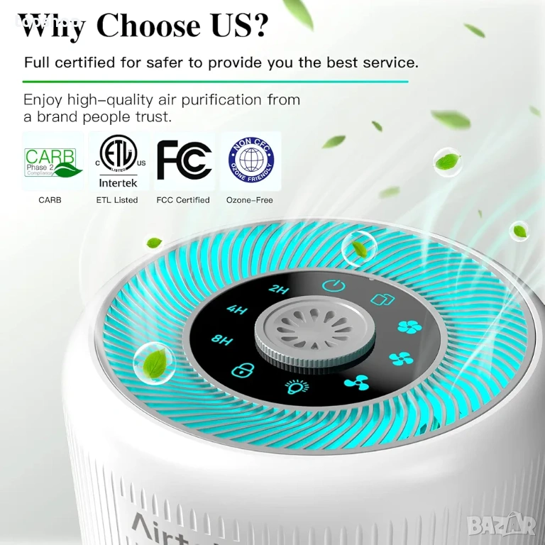 Ефективна филтрация: Снабден с H13 True HEPA филтър, който улавя частици до 0.1 микрона, включително прах, полени, дим и миризми от домашни любимци.