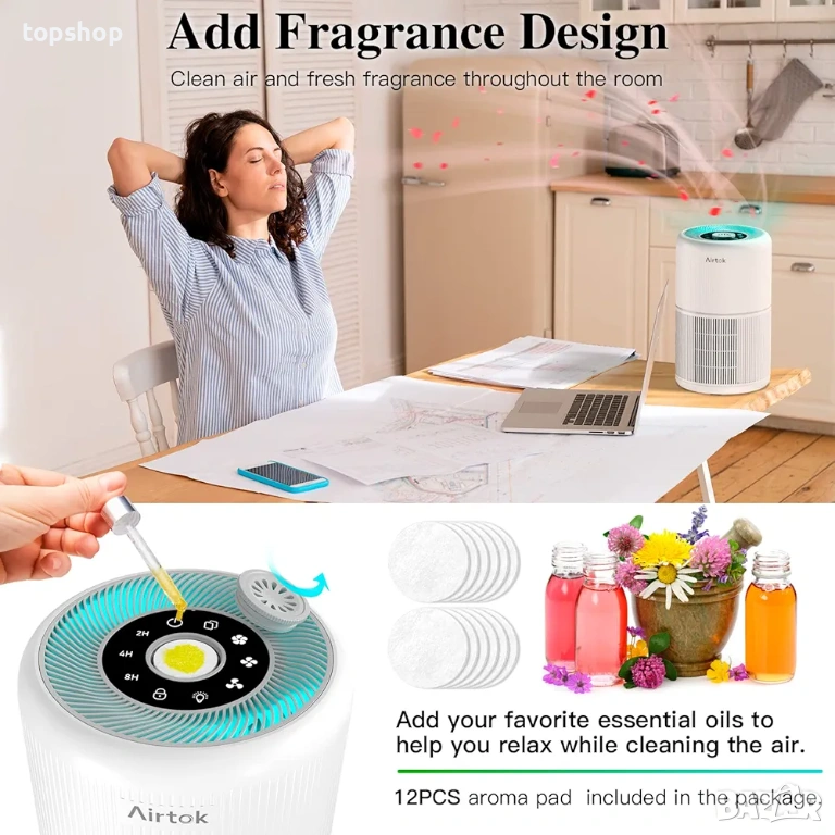 Ароматерапия: Вградена гъба за етерични масла, която разпръсква любимия ви аромат в цялата стая заедно с чистия въздух.