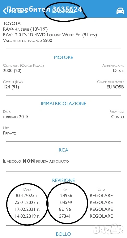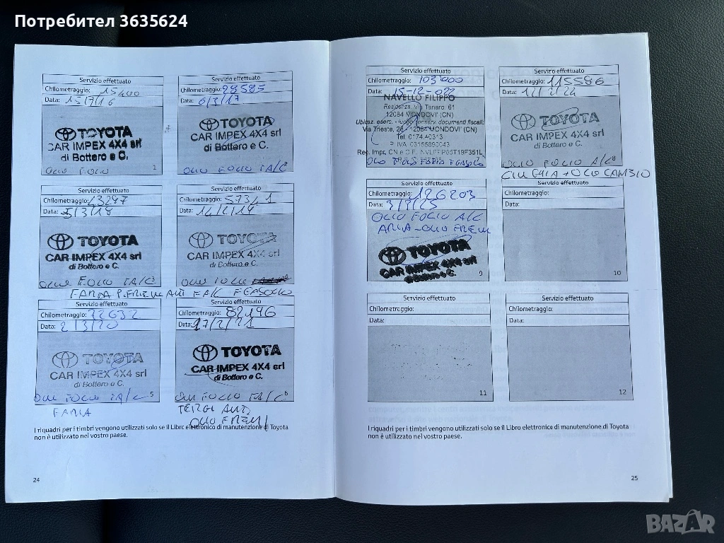 Прилагам снимка на сервизната книжка - последно обслужване на 03. 03. 2025г. на 126 203 км. и справка за техническите прегледи от последните 7 години в Италия - последният е на 08. 01. 2025г. на 124 956 км.