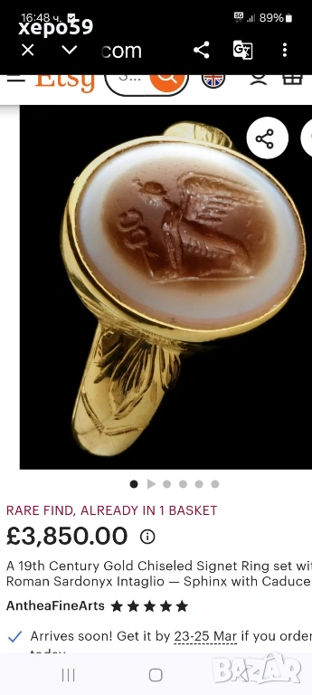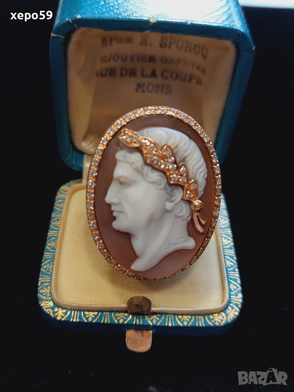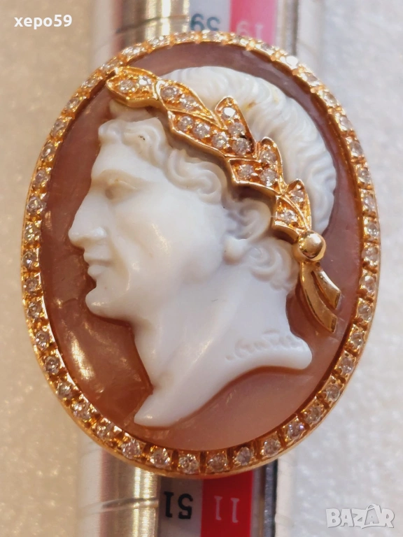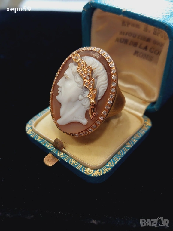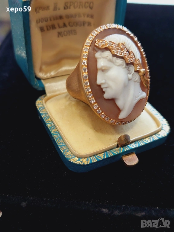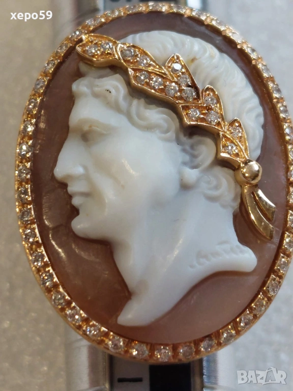 Показвам ви това прекрасно бижу.Дамски масивен златен пръстен,18 каратово матирано злато,огромна камея обградена с 45 брилянта и златна апликация ,лавров венец, обсипан с диаманти.Уникална ръчна работа,моето най дълбоко уважение към майстора''респект'' както му казват сега.
