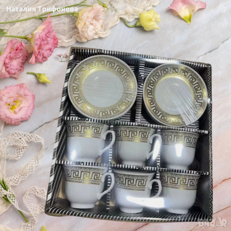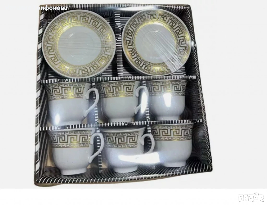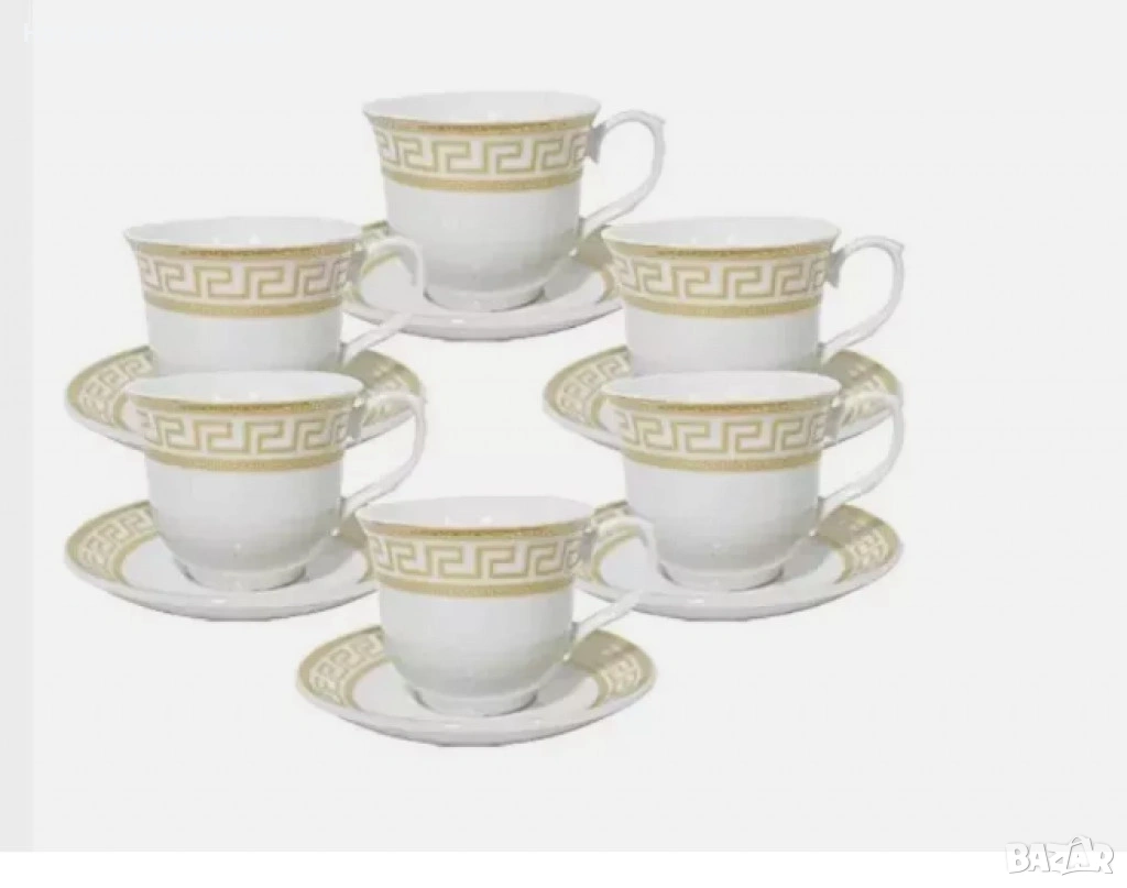 Изящен 12-парчен порцеланов сервиз за чай, включващ чаши и чинийки с изящен гръцки мотив. Комплектът е нов и готов за употреба, идеален за сервиране на чай или кафе.