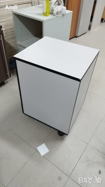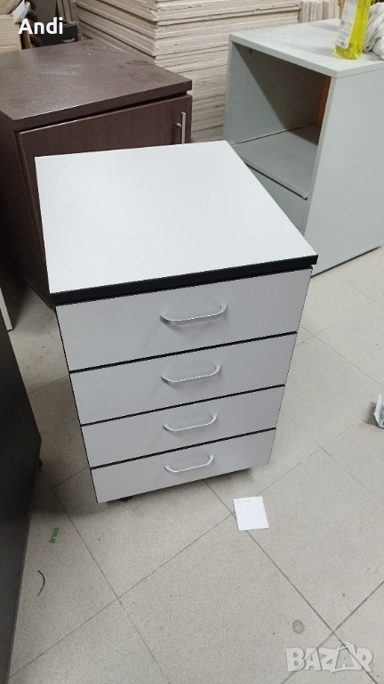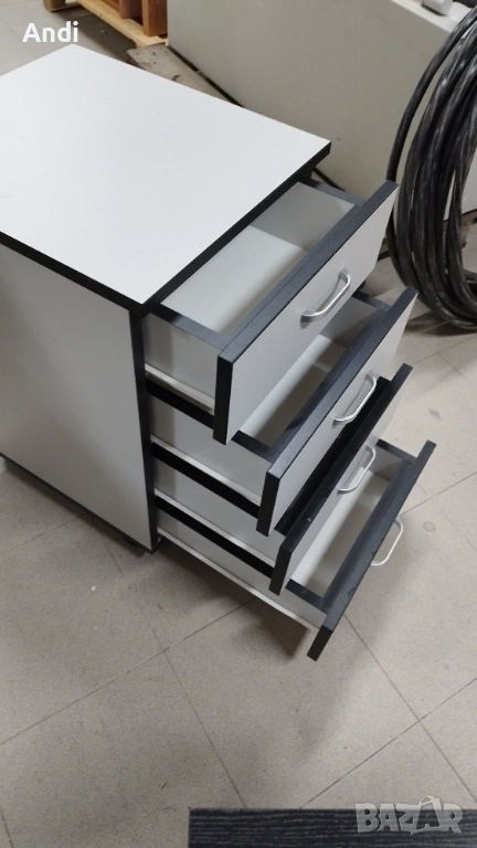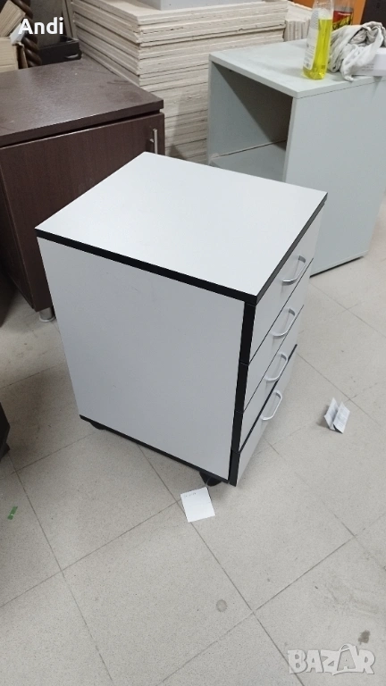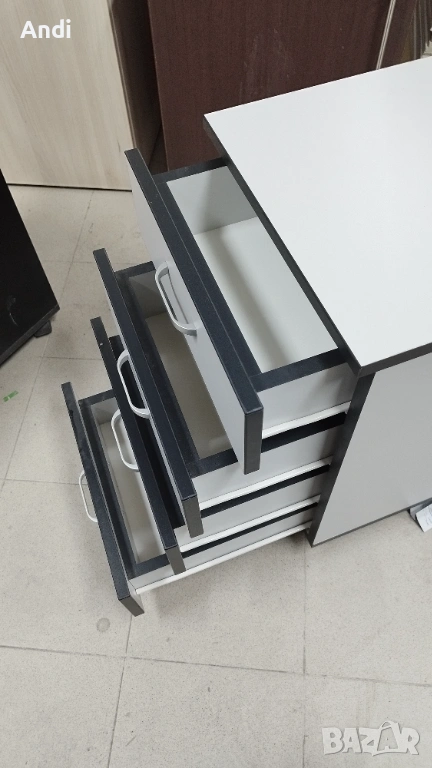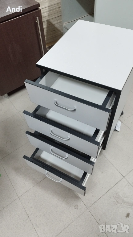 3) Продавам Офис шкаф с четири чекмеджета на колела и - контейнер за бюро с цвят светло сиво към бяло с черни кантове. Размерът е: височина - 40см; дълбочина 45см.; широчина - 63см. Шкафът / контейнера е запазен, здрaв и функционален метни - дръжки и чекмеджета. Шкафа е запазен и всички механизми са работещи в отлично състояние, на места може да има дребни драскотини.Цена 53€