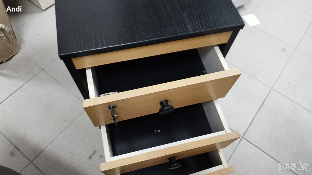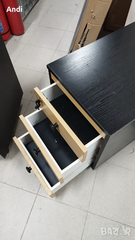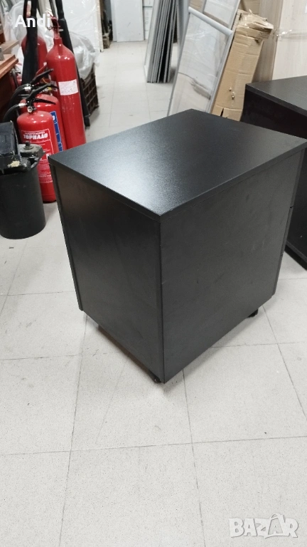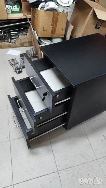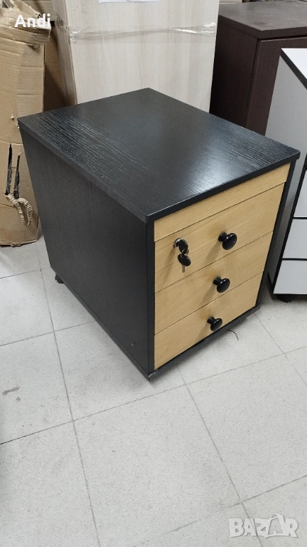 2)Офис шкаф три чекмеджета на колела - контейнер за бюро с цвят черен със заключване на едно най - горното чекмедже челата на чекмеджетата са цвят бук. Размерът е: ширина 41 см /дълбочина 56см / височина 55см. . Шкафът / контейнера е запазен, здрaв и функционален черни - дръжки на чекмеджета цвета е черен с фладер. Цена 53€.