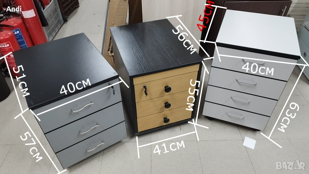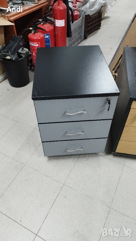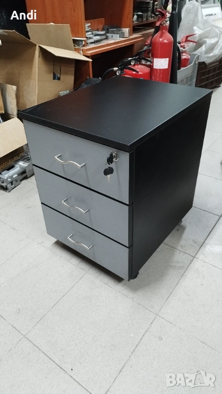 1) Офис шкаф с три чекмеджета за канцеларски материали. Шкафа е на колела и - контейнер за бюро със заключване на всички 3 чекмеджета цвета е светло сив с черни кантове и черен дебел плот . Размерът е: ширина 40см /дълбочина 50см / височина 57см. Шкафът / контейнера е запазен, здрaв и функционален метни - дръжки и чекмеджета. Шкафа е запазен и всички механизми са работещи в отлично състояние, на места може да има дребни драскотини.