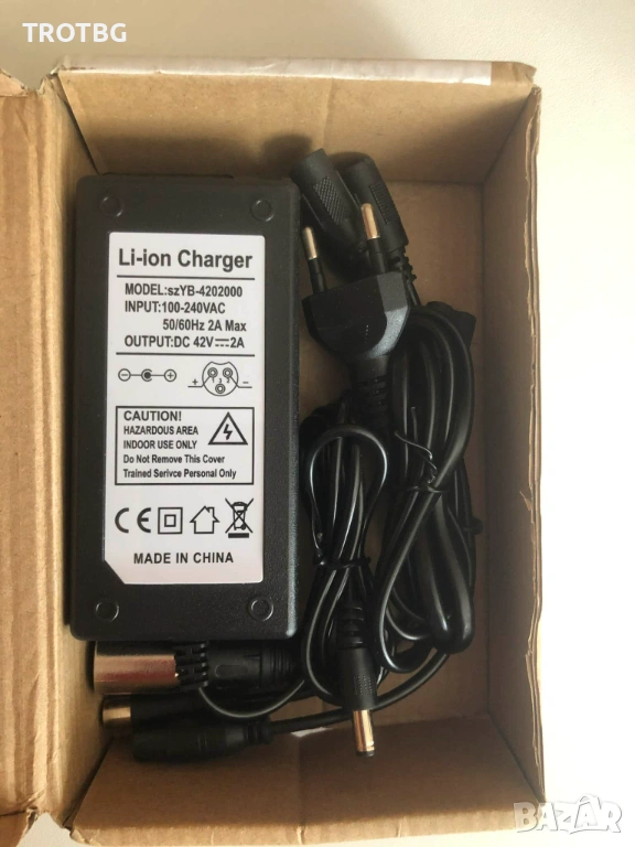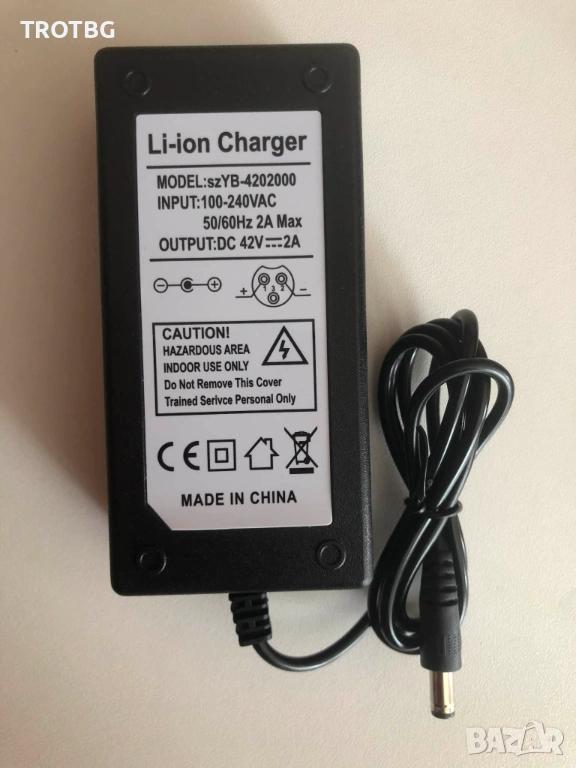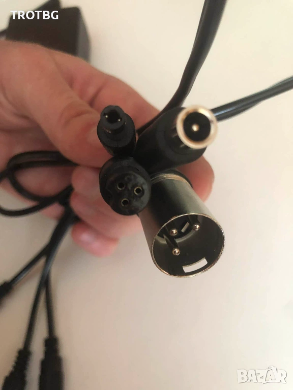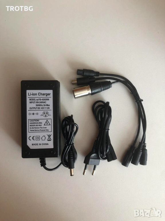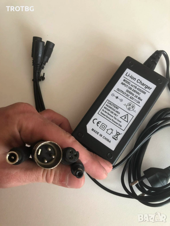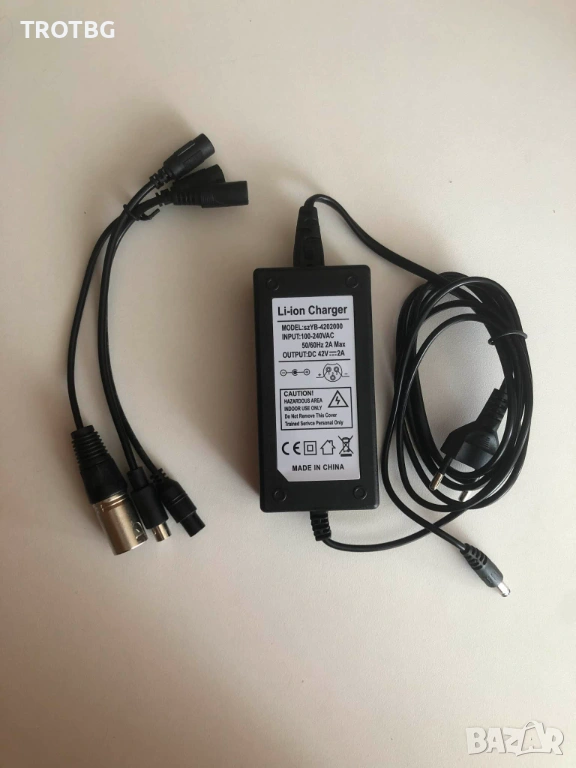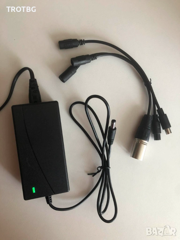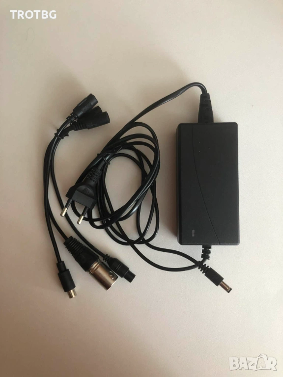Зарядно устройство 42V 2A с 4 смеяеми букси за зареждане на електрически велосипеди, тротинетки, скутери и ховърборди. Портовете са XLR Head, Xiaomi 8mm, DC5525 (5.5×2.5) и Aircraft 9mm
