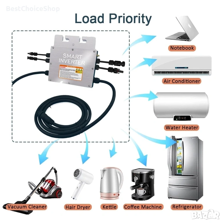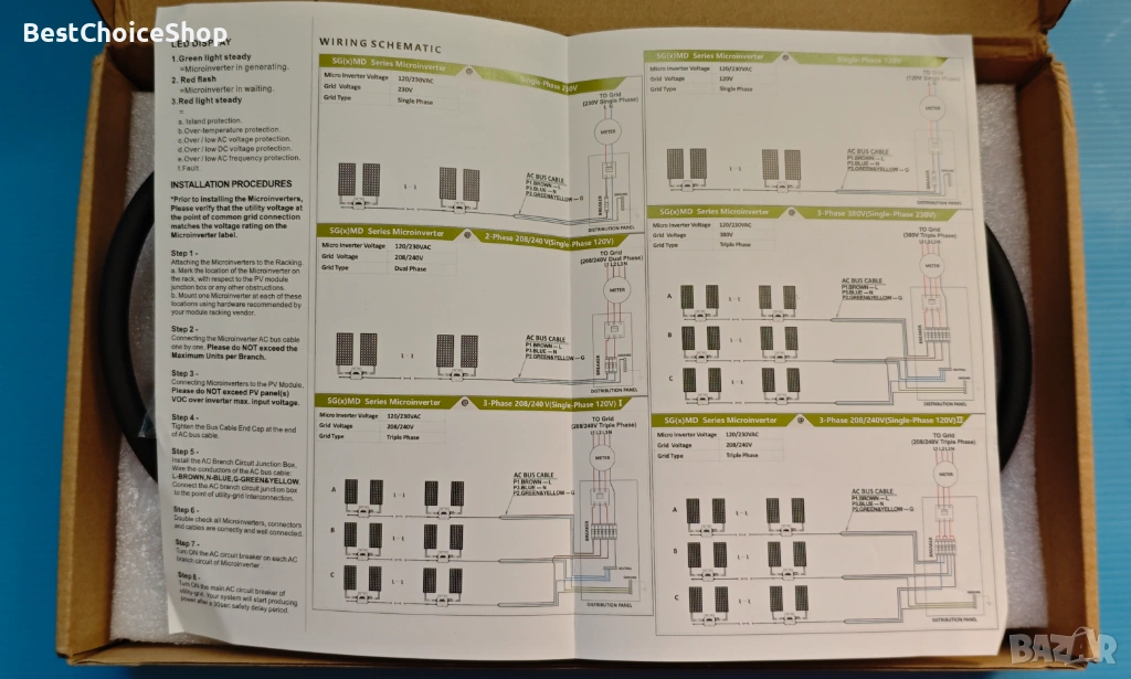 - Инвертор: преобразува електричеството от слънчеви панели в използваема енергия. Еднофазните микро инвертори често се използват в жилищни сгради и малки рекламни площи (поддържат еднофазно или трифазно свързване)