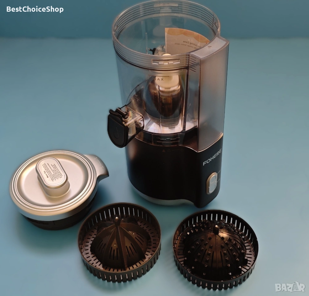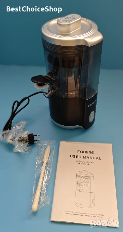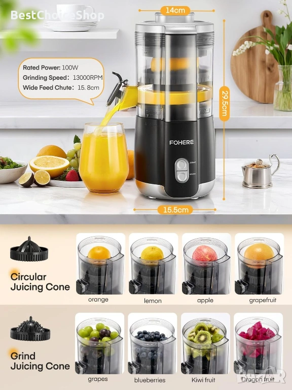 цитрусовата сокоизстисквачка FOHERE впечатлява с високото си качество и атрактивен дизайн. 100-ватовият мотор е толкова мощен, че приготвя чаша сок само за 40 секунди - работи тихо, без да се клатушка или преобръща. За разлика от други сокоизстисквачки, просто трябва да натиснете бутона "Старт" и машината започва да изцежда сок, оставяйки ръцете ви свободни.