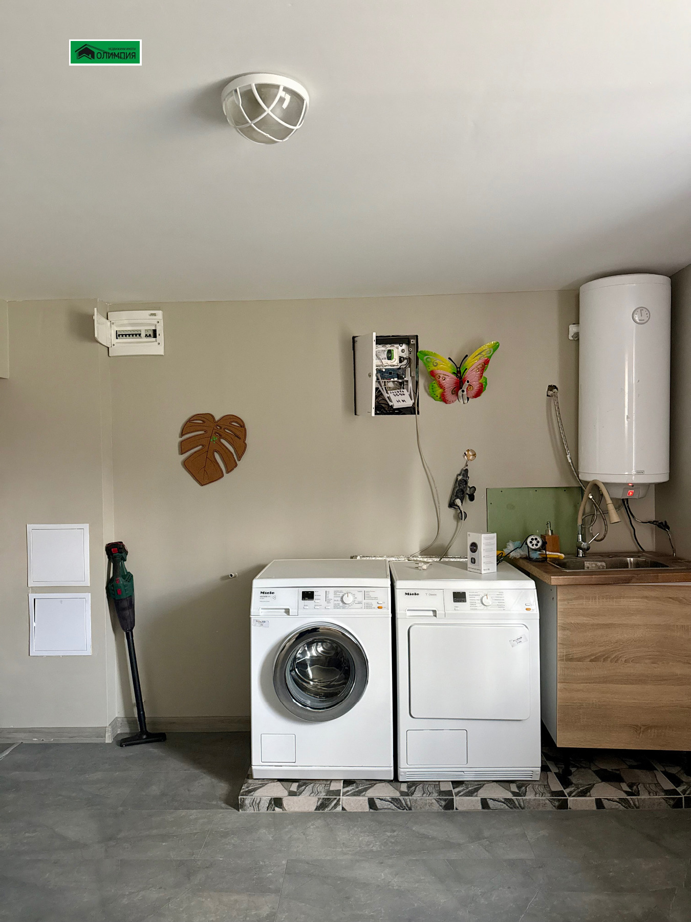 Първи етаж изключително просторна дневна зона, обединяваща хол, кухня и трапезария, спалня, перално помещение и баня с тоалетна.