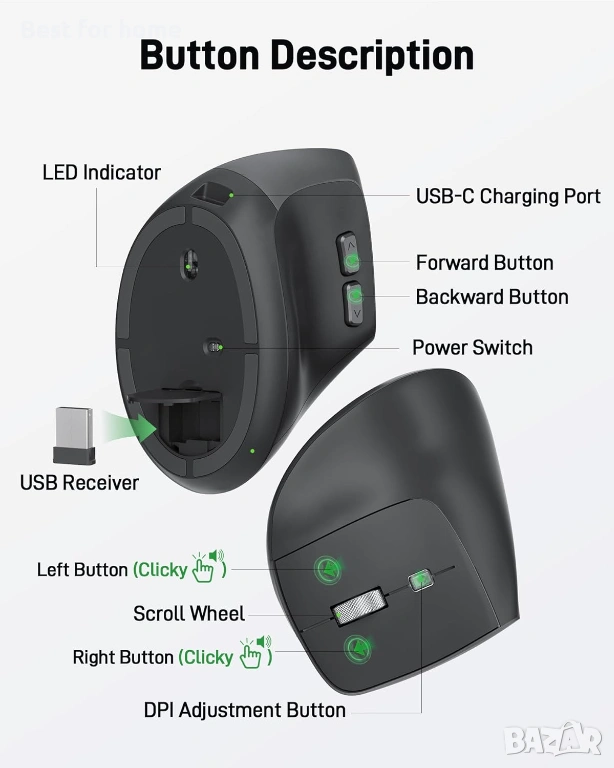 [2.4GHz безжична връзка] Тази безжична ергономична мишка предлага бърза и стабилна 2.4GHz безжична връзка. Можете лесно да я свържете чрез включения USB-A приемник, осигурявайки безпроблемна работа с надежден обхват до 10 м. НЕ Bluetooth връзка. USB A приемникът се съхранява вътре в мишката.