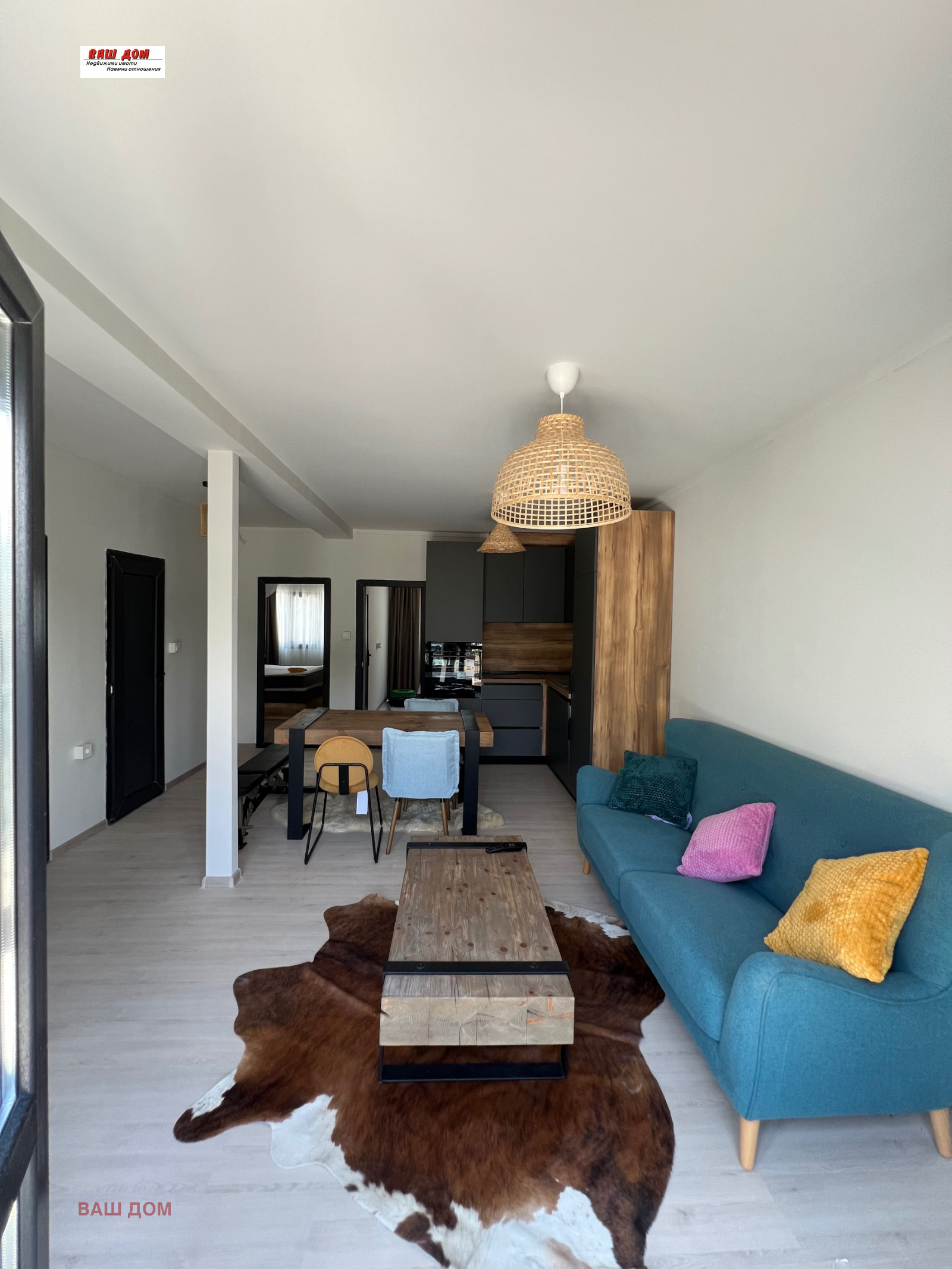 Имотът е с РЗП-60 кв.м. и има следното разпределение: входно антре, просторен дневен тракт с изцяло оборудвана кухня, две спални, перално помещение, баня-тоалет и веранда.