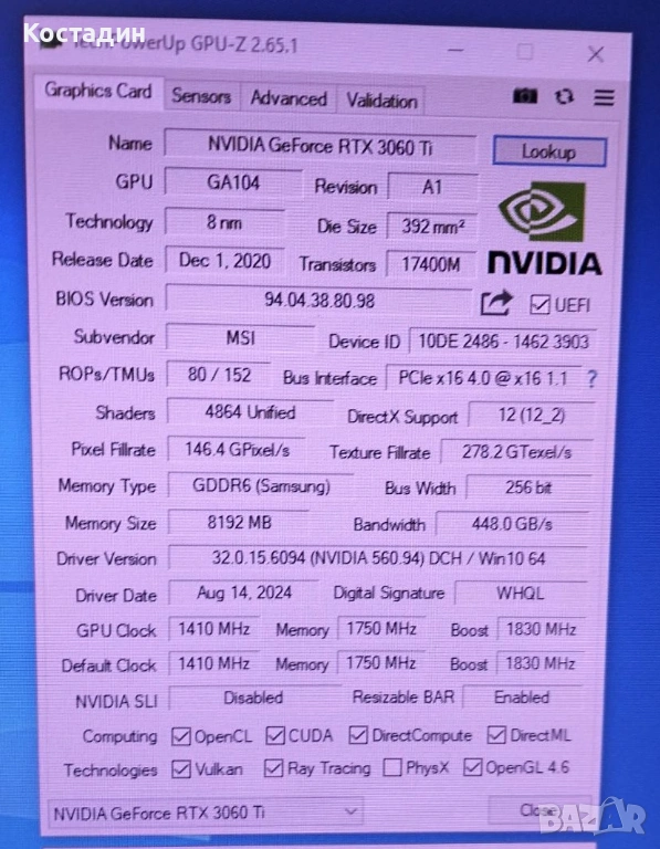 Видео карта MSI GeForce RTX 3060 Ti 8GB GAMING Z TRIO OC - няма гаранция