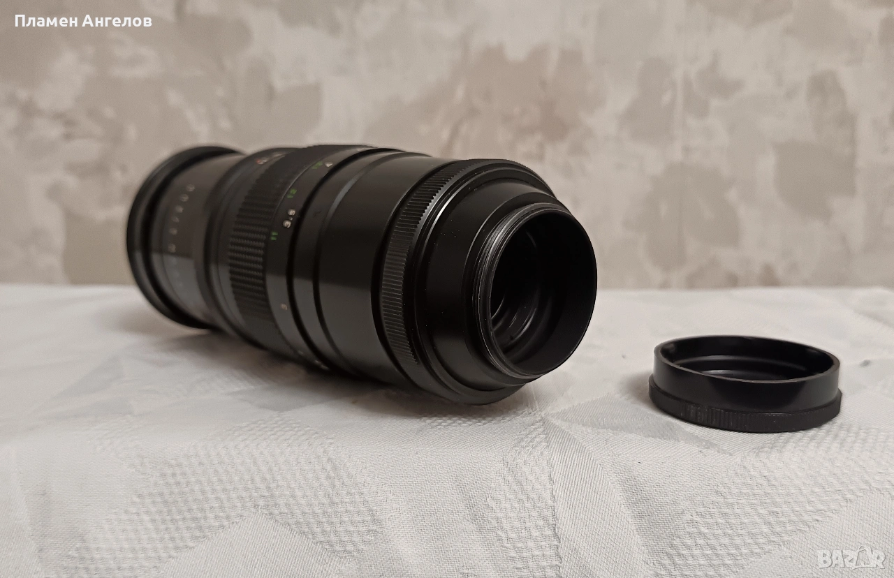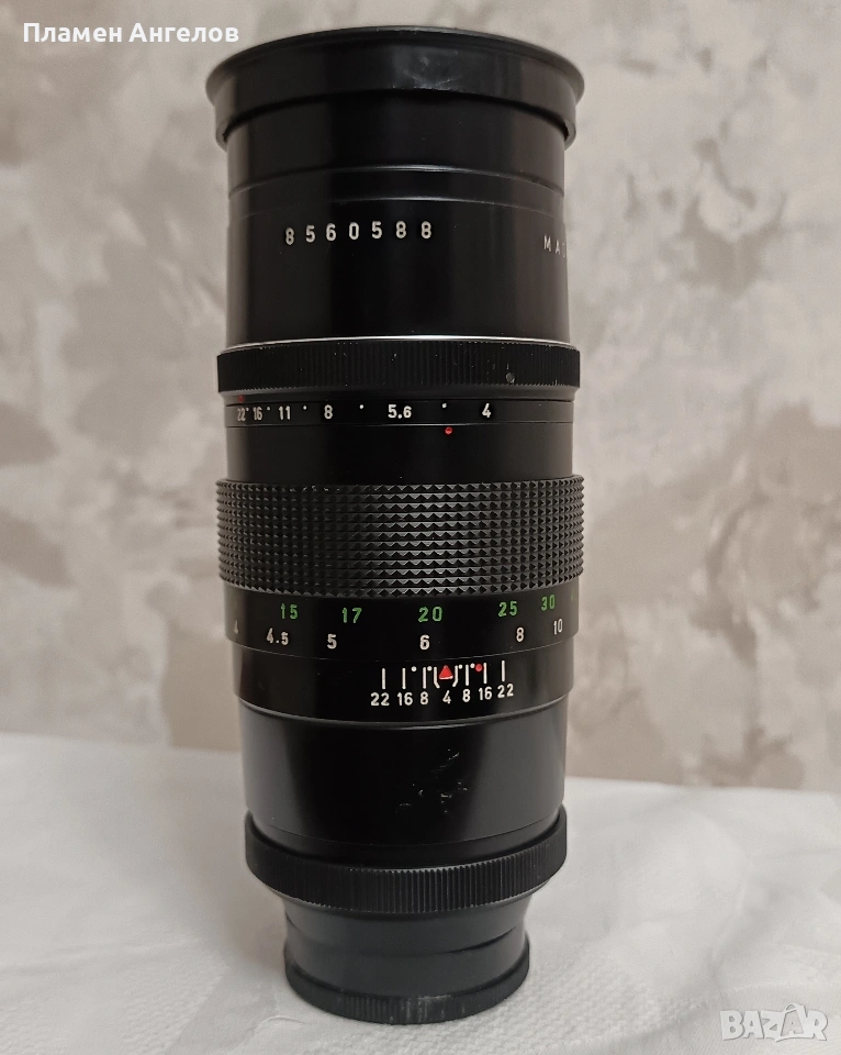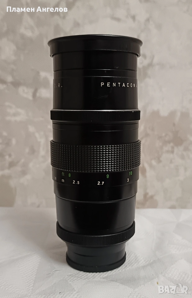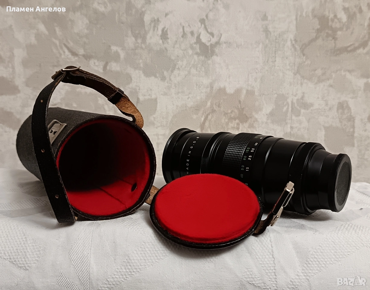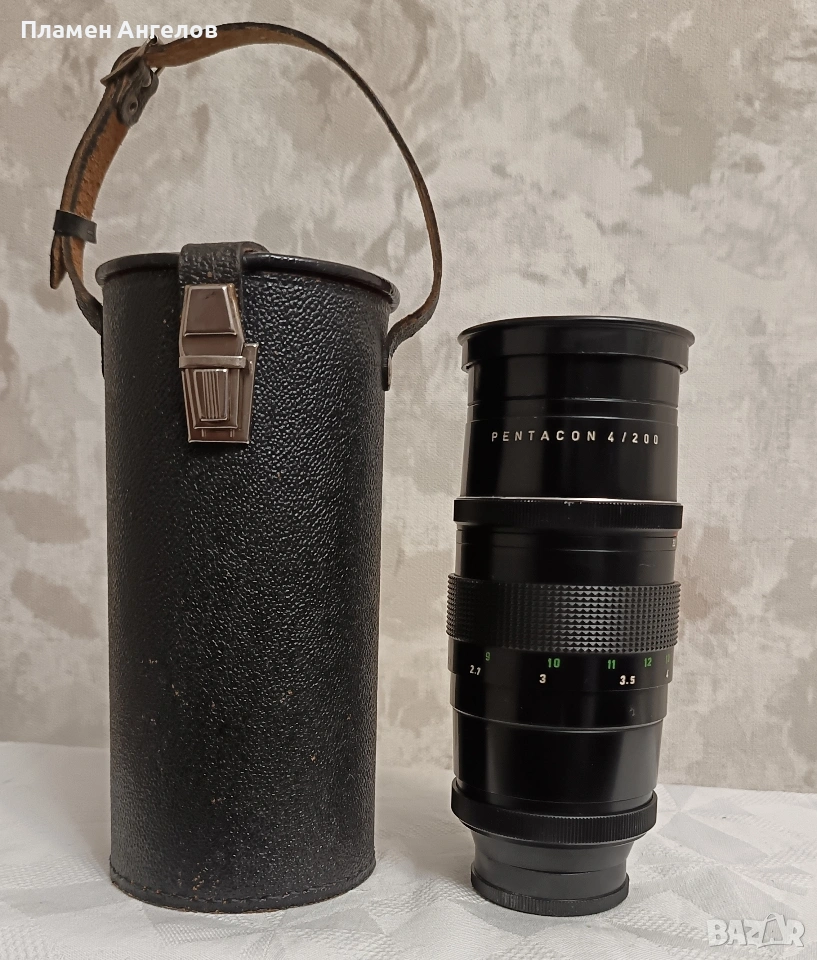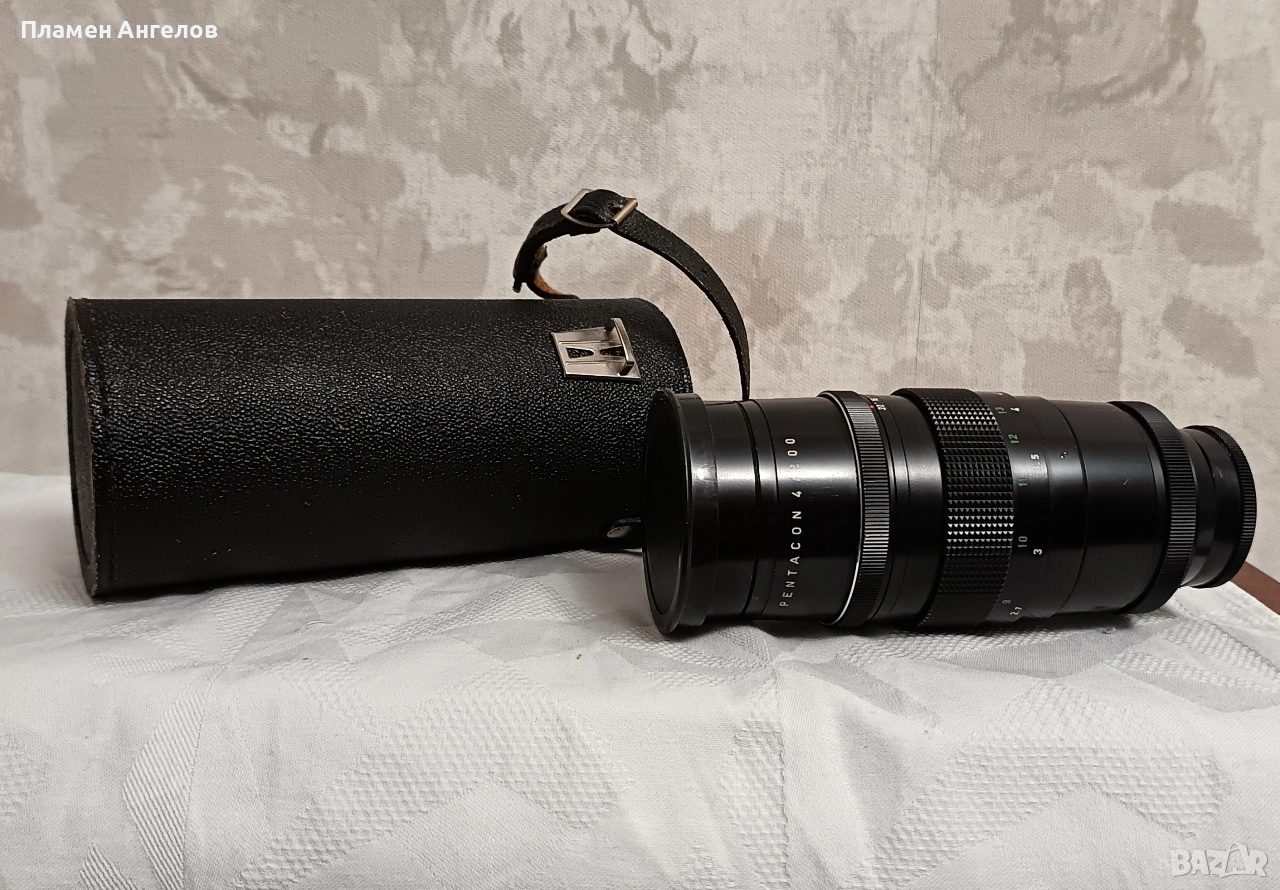 Ретро обектив Pentacon 200мм f4 известен като Pentacon 4/200 произведен в ГДР. Ръчно фокусен телеобектив с фиксирано фокусно разстояние. Разполага с твърд кожен калъф с кадифена вътрешност. Обектив версия " Peset" с 15 ламела на диафрагмата и два пръстена за бленда. Плавно движение на гривните. Без драскотини. и умасляване на лещите. В отлично състояние, чудесно запазен.