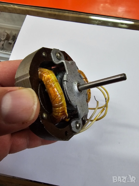 Виждат се типичните елементи — **статорни намотки**, **ламинирано желязно ядро** (характерните наслоени пластини), **изходящ вал** и **захранващи проводници** (жълт и бял).